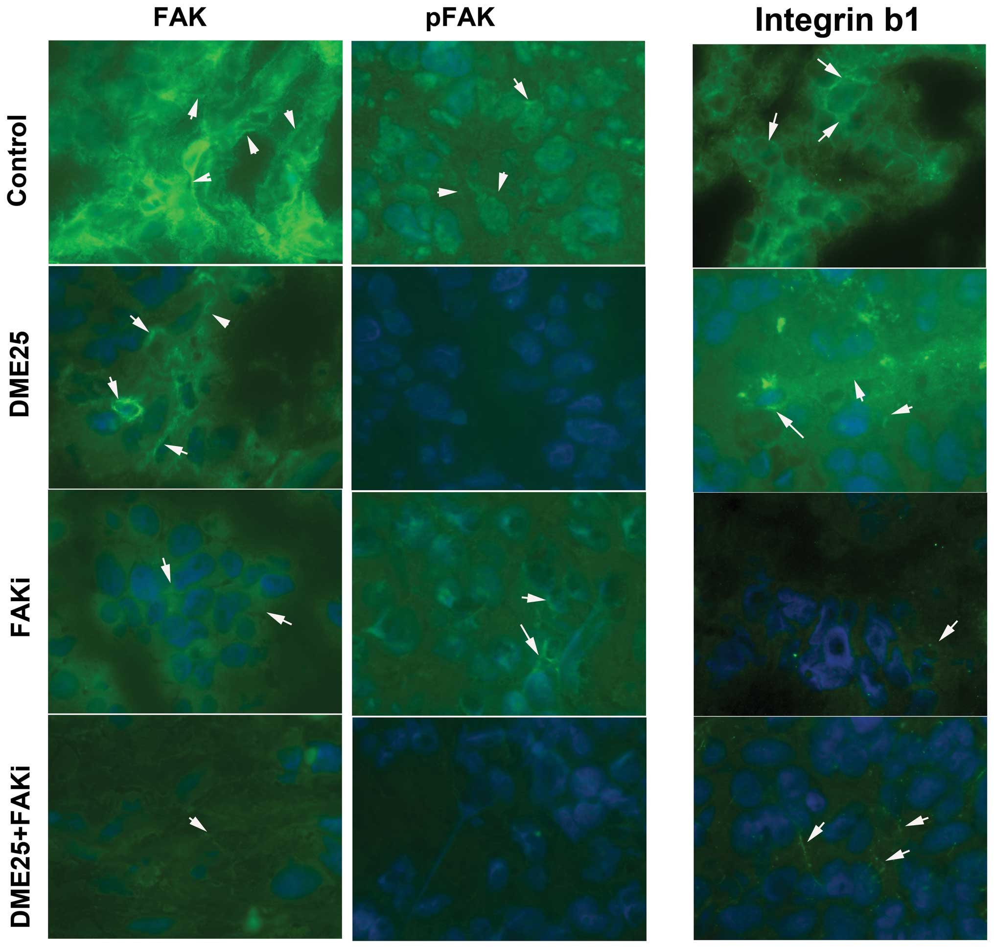 We examined the staining pattern of FAK and paxillin by comparing the total proteins and phosphorylated forms using antibodies that recognized total FAK/paxillin or the phospho-specific proteins. Osteosarcoma tumour cells stained strongly for total FAK and also phospho-FAK (Fig. 7, indicated by arrows). Tumours from mice which received DME25, the FAK inhibitor and the DME25/FAK inhibitor combination showed a marked reduction in phospho-FAK staining, but to a lesser degree for the staining of total FAK. Similar to total FAK, a reduction in integrin staining was noted in tumours from mice that received treatment.
