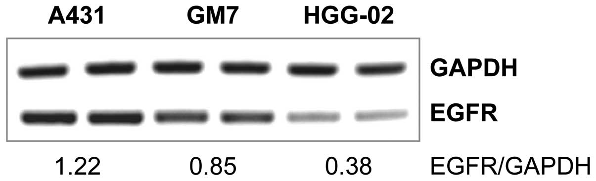 In our previous study, we reported the unusual loss of EGFR gene copy in GBM obtained from a patient with an unusually favorable course of the disease who experienced a survival of 5.5 years between diagnosis and death (8). Here, we present further detailed analysis of the HGG-02 cell line derived from this tumor when compared with the GM7 reference cell line that contains a standard EGFR gene copy number (9).