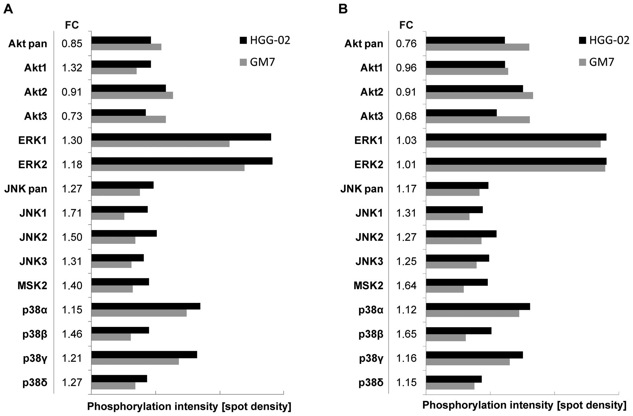 To examine RTK downstream pathways activated in the HGG-02 cells, we employed phospho-MAPK arrays. We also performed the phospho-MAPK arrays on cells cultivated under serum-containing and serum-free conditions, as described above. An Akt pan-specific antibody revealed an overall diminished level of signaling through the Akt pathway in the HGG-02 cells when compared to the GM7 cells in the serum-containing and serum-free conditions (Fig. 3). However, differences in the phosphorylation levels of Akt1, Akt2 and Akt3 kinases were observed. Akt1 was more phosphorylated in the HGG-02 cells in the serum-containing but not in the serum-free conditions, whereas the levels of Akt2 and Akt3 phosphorylation were decreased regardless of the conditions. In addition, we detected an upregulation of signaling through the p38 pathway, JNK pathway and MSK2 in the HGG-02 cells. ERK1 and ERK2 signaling was also slightly elevated in the HGG-02 cells but only under the serum-containing conditions (Fig. 3A).