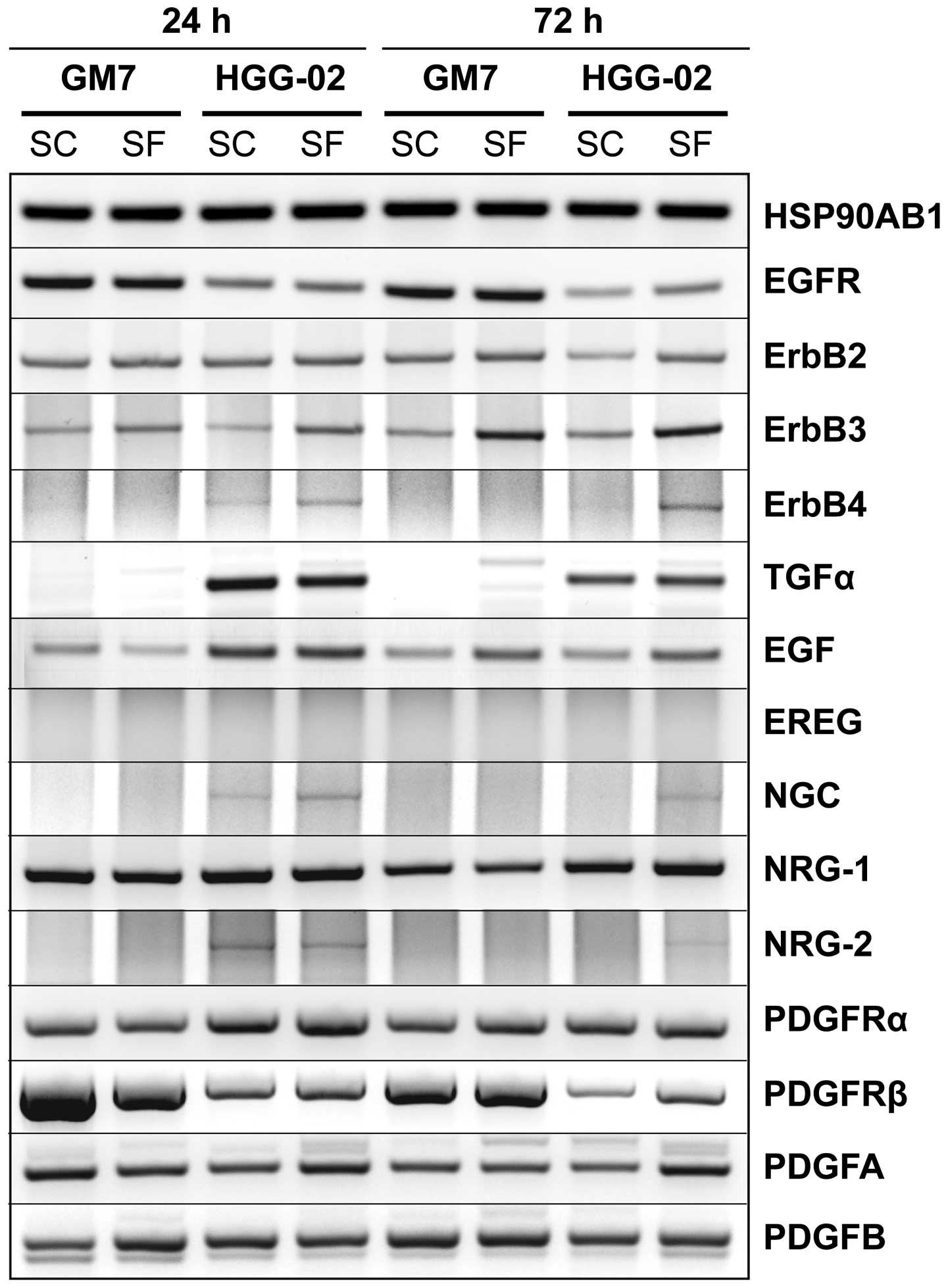 As expected, expression of EGFR was decreased in the HGG-02 cells and did not significantly vary with time or under serum-free conditions. Although there was no difference in the expression of ErbB2, ErbB3 expression was higher under serum-free conditions and increased with time in both cell lines. ErbB4 expression was detected in the HGG-02 cells only and was stronger in the serum-free conditions. These patterns of expression were observable for its ligand NRG-2 and for the ErbB3-specific ligand NGC. In contrast to the low levels of EGFR mRNA, strong expression of the EGFR-specific ligand TGF-α was observed in the HGG-02 cells but not in the GM7 cells. EGF, the second EGFR-specific ligand, was also upregulated in the HGG-02 cells. Nevertheless, after 72 h of cultivation, the expression of EGF did not differ between cell lines and was higher in the serum-free conditions. Finally, the expression of NRG-1 increased in the HGG-02 cells after 72 h of cultivation, and EREG was not expressed in any of the samples.