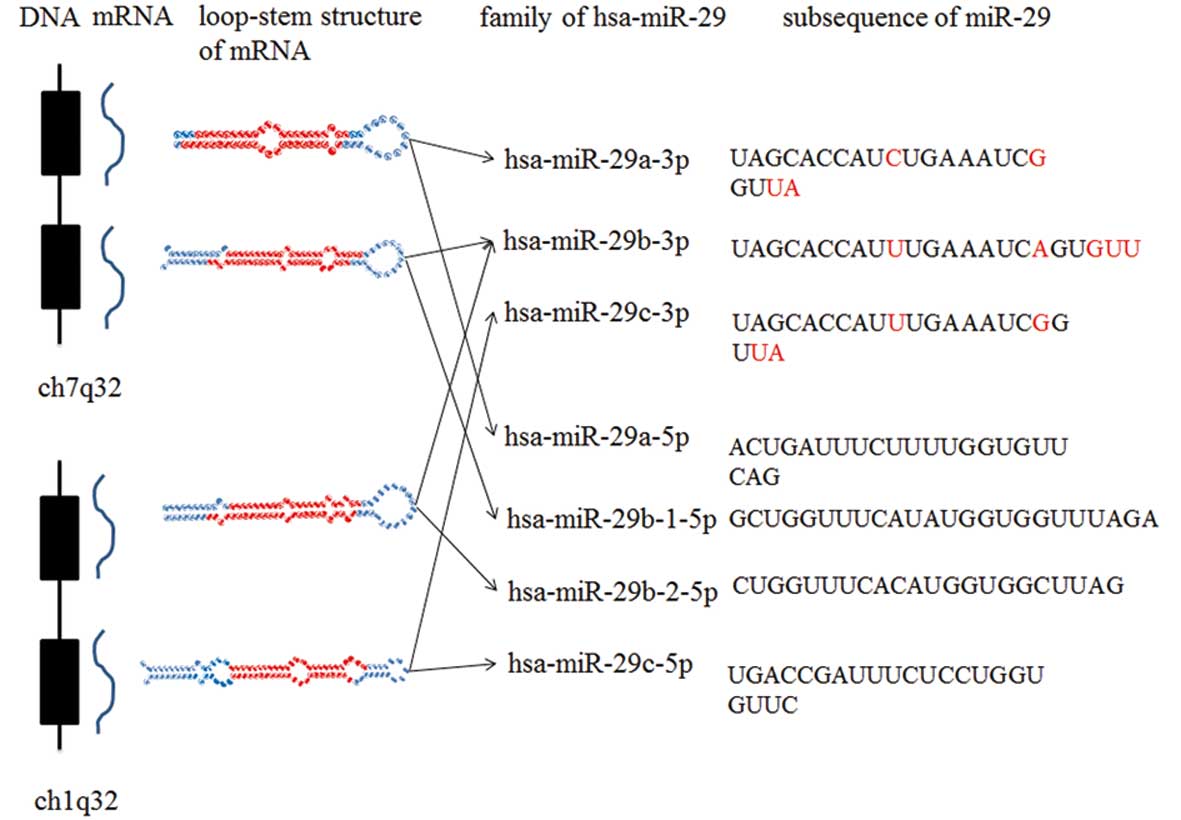 These three miR-29s are distributed on two chromosomes: miR-29b2/miR-29c located on chromosome 1q32 and miR-29b1/miR-29a located on chromosome 7q32 (20). Among the members of the miR-29 family, miR-29a was firstly discovered by Lagos-Quintana et al (21). Subsequent large-scale cloning studies revealed the sequence of mature miR-29a. Mourelatos et al (22) identified miR-102 located on chromosome 7 primordially, which was known as miR-29b because of the isogeny between human miR-102 and mouse miR-29b. Researchers then found the same sequence on chromosome 1q32. Researchers distinguished them as miR-29b1 located on chromosome 7q32 and miR-29b2 located on chromosome 1q32. With the development of technology, miR-29c was found by small RNA library sequencing (23).