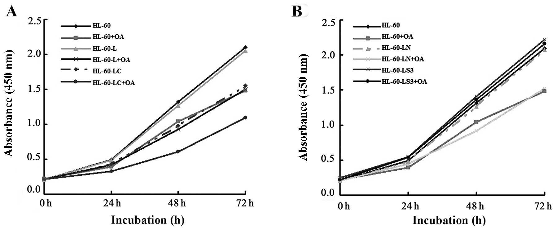 HL-60 cell activity was significantly decreased 72 h after the addition of OA, with absorbance values of 2.10±0.22 vs. 1.48±0.12 (P<0.01). The activities of the HL-60-LC cells were decreased at 48 and 72 h, with absorbance values of 1.32±0.12 vs. 0.98±0.14 (P<0.05) and 2.10±0.22 vs. 1.55±0.09 (P<0.01), respectively. The proliferation of HL-60-LC+OA cells decreased in the first 24 h, with absorbance value of 0.49±0.10 vs. 0.33±0.02 (P<0.05). Cell proliferation inhibition was more significant in the HL-60-LC+OA cells than in the HL-60+OA and HL-60-LC cells. These results indicated that both CAV-1 and OA inhibited HL-60 cell proliferation, and the inhibitory effect was more significant in the HL-60-LC+OA cells (Fig. 3A).