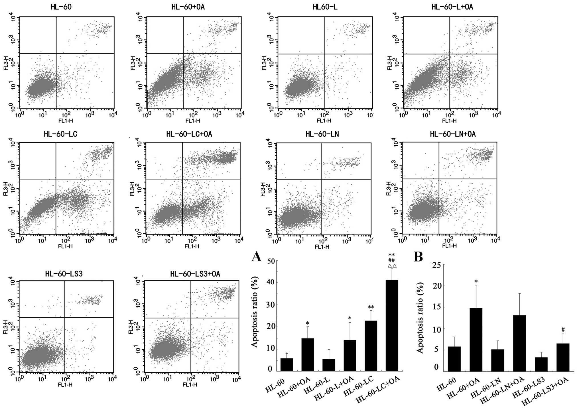 At 24 h after each treatment, the apoptosis levels of each group were detected using flow cytometry (Fig. 4). The apoptotic rates of the HL-60, HL-60+OA, HL-60-LC, HL-60-LC+OA and HL-60-LS3+OA groups were 5.79±2.30, 14.78±5.39, 22.8±4.64, 41.19±5.07 and 6.55±2.23%, respectively. The results showed that both OA treatment (P<0.05) and cav-1 overexpression (P<0.01) promoted HL-60 cell apoptosis, and the apoptosis levels of the HL-60-LC+OA cells were significantly higher than that of the HL-60+OA (P<0.01) or HL-60-LC cells (P<0.01). These data suggest that OA and CAV-1 promote apoptosis of HL-60 cells, and the joint treatment had a more significant pro-apoptotic effect (Fig. 4A).