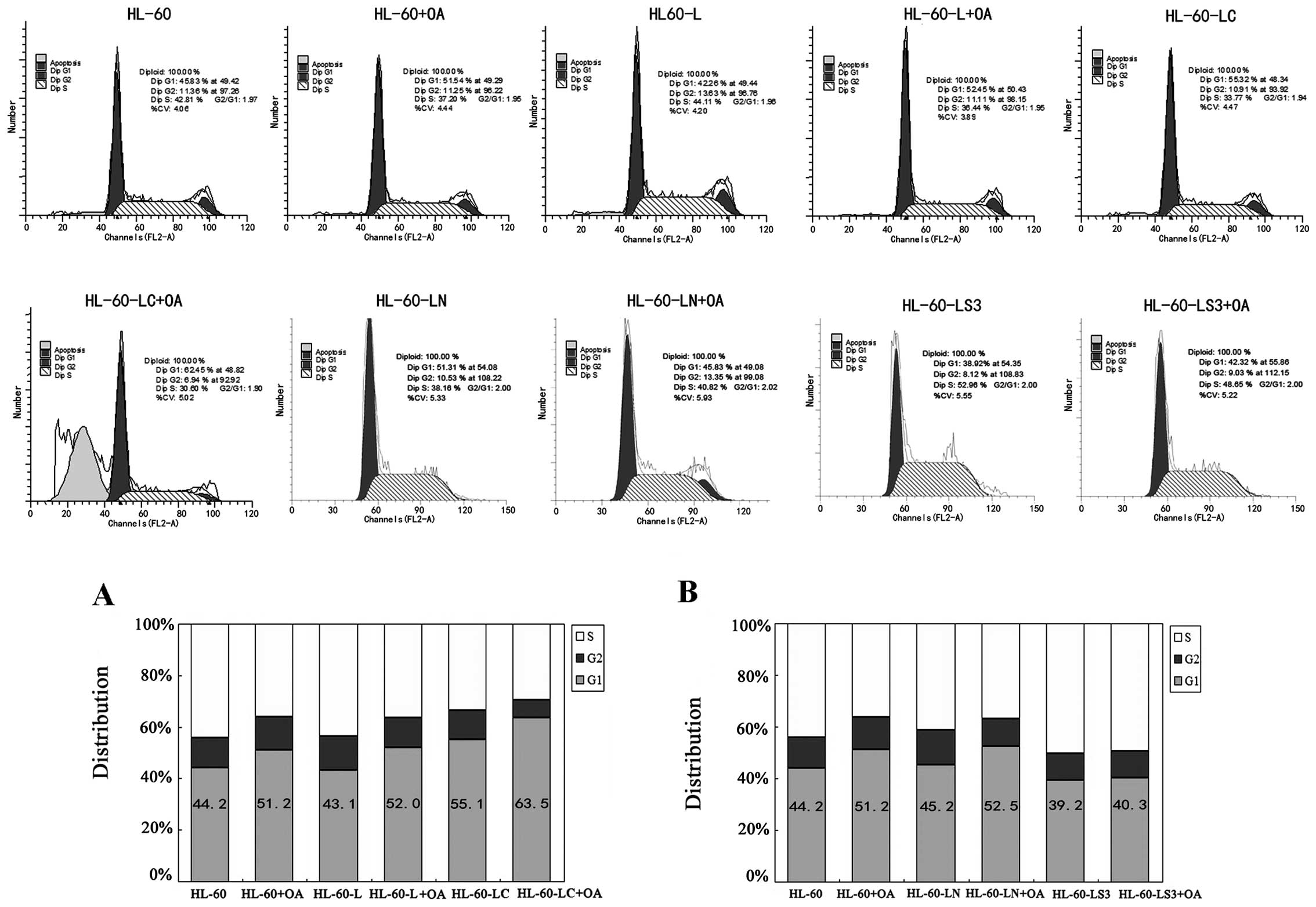 The percentage of HL-60-LS3+OA cells in the G1 phase did not differ from that of the HL-60 group but was decreased by 10.9±3.4% (P<0.01) compared with that of the HL-60+OA group, indicating that cav-1 gene silencing hampered the OA effect on the G1 arrest of HL-60 cells (Fig. 5B).