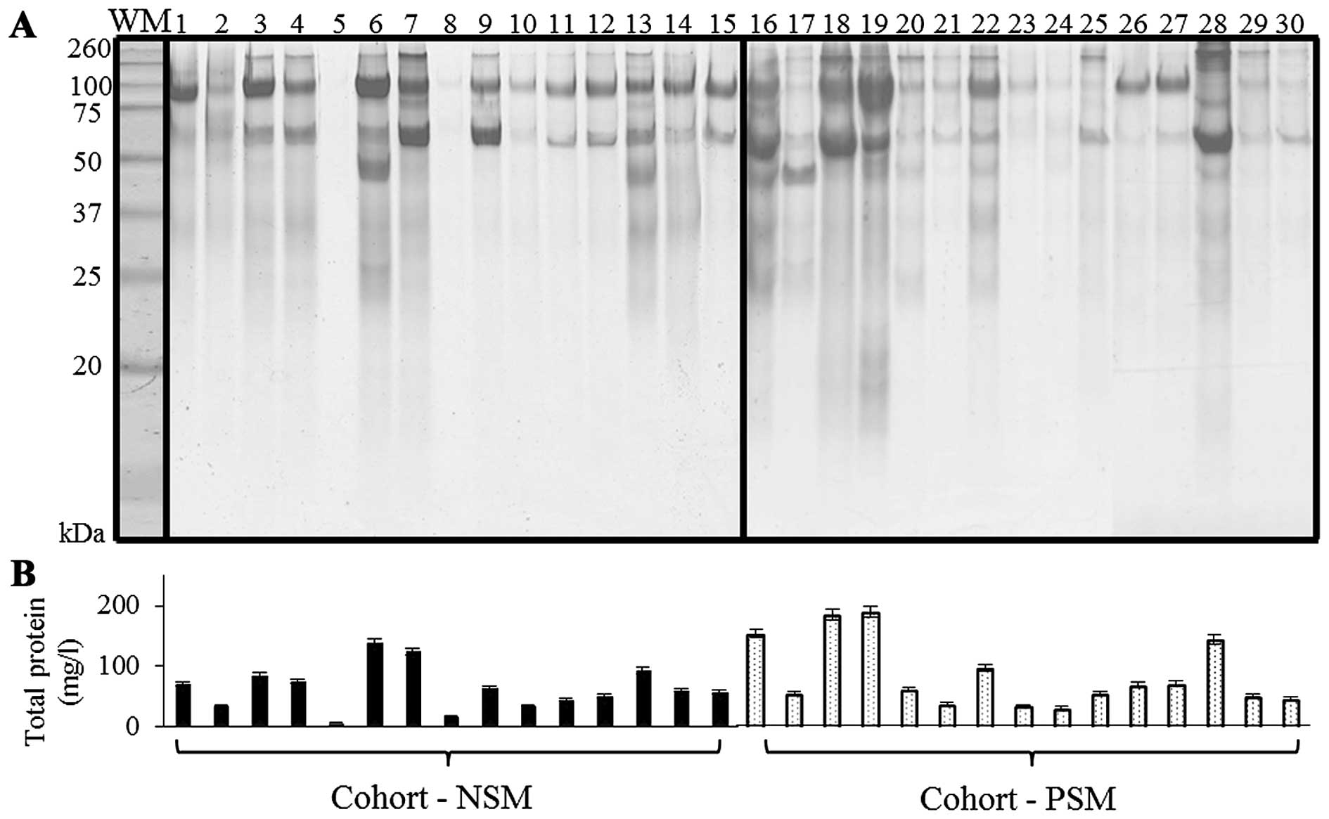 The migration of the molecular weight marker and urinary proteins of NSM, PSM patients on SDS-PAGE is presented in Fig. 1A. SDS-PAGE is a rapid and simple technique for protein pattern elucidation, quantification and determination of groups of proteins with similar molecular weight (Mr) (19). The visualization of NSM/PSM groups revealed proteins with relatively wide range of Mr that, according to previously published results, correspond to commonly present albumin (Mr 60–70 kDa); 80–110 kDa range belongs to transferrin and uromodulin (formerly Tamm-Horsfall protein), together with albumin polymeric complexes can be determined, in 160–200 kDa range the major band is commonly dedicated to IgG, IgA monomers and C3. Less distinct bands at Mr 31 kDa were previously linked with carbonic anhydrase (20–22). For confirmation, total proteins in urinary specimens were quantified spectrophotometrically (Fig. 1B). Higher protein levels were determined in PSM cohort (85.3±55.9 mg/l) when compared to NSM one (mean 64.1±36.2 mg/l).