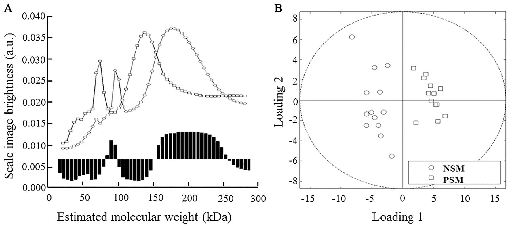 As seen in Fig. 2A, in our NSM/PSM model the proteins in mass ranges of 80–99 and 150–235 kDa were evaluated as the most significant in discrimination between examined groups. The quadrant expression based on comparison of the curves projection shows separate distribution of both NSM and PSM groups (Fig. 2B).
