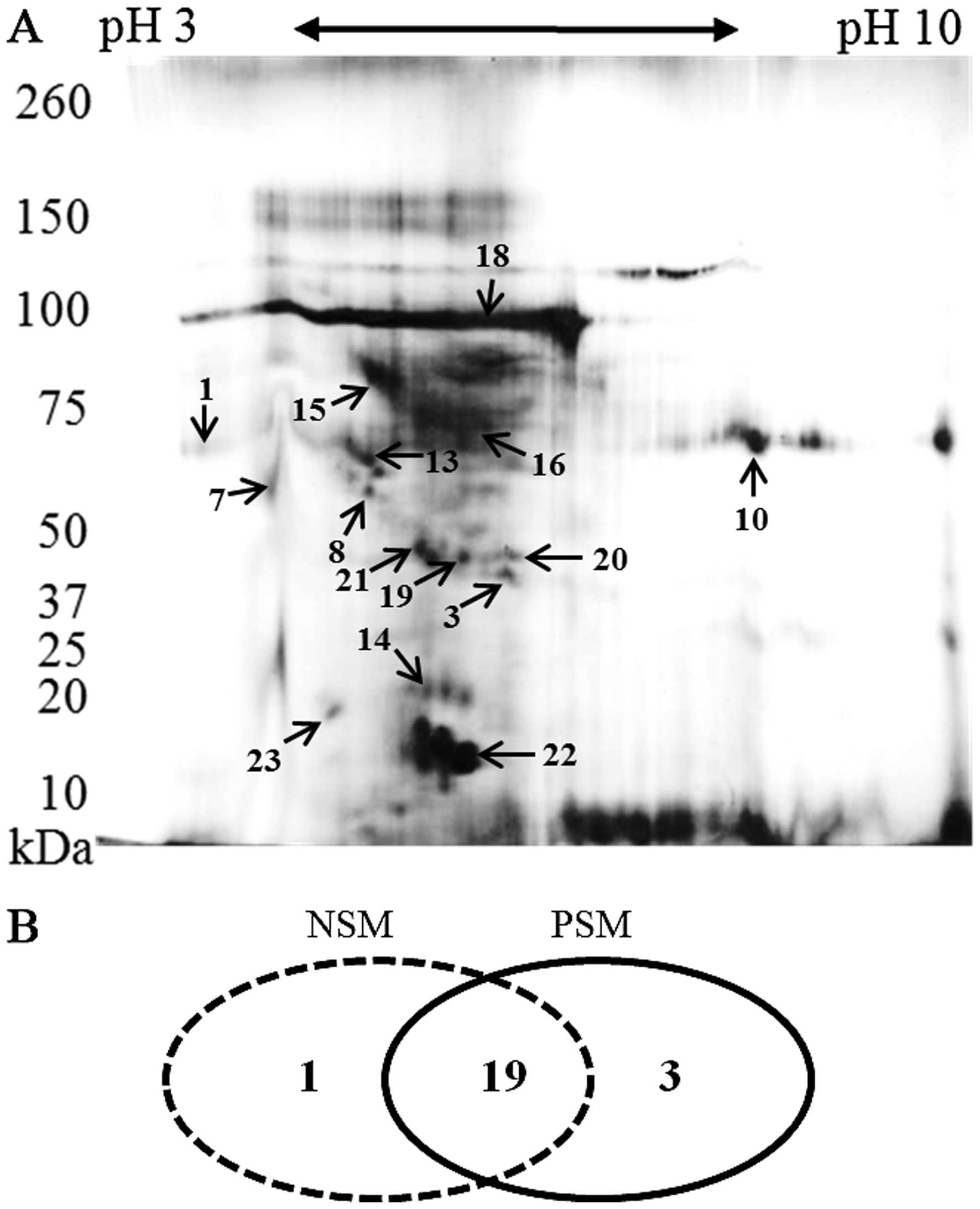 Following 2D-PAGE and staining, the most prominent spots were picked up for the MS analysis. Their positions in the 2-D map of representative subject belonging to PSM group are shown in Fig. 3A. Some proteins were presented as a horizontal row of multiple spots (with small changes in pI and molecular weight), likely caused by variable posttranslational modifications (24). The identified proteins and their characteristics are shown in Table III. It was revealed that majority of proteins (19 overlaping proteins) can be identified in both groups. In both, PSM and NSM groups, unique proteins were found (n=1 in NSM; n=3 in PSM) as depicted in Fig. 3B.