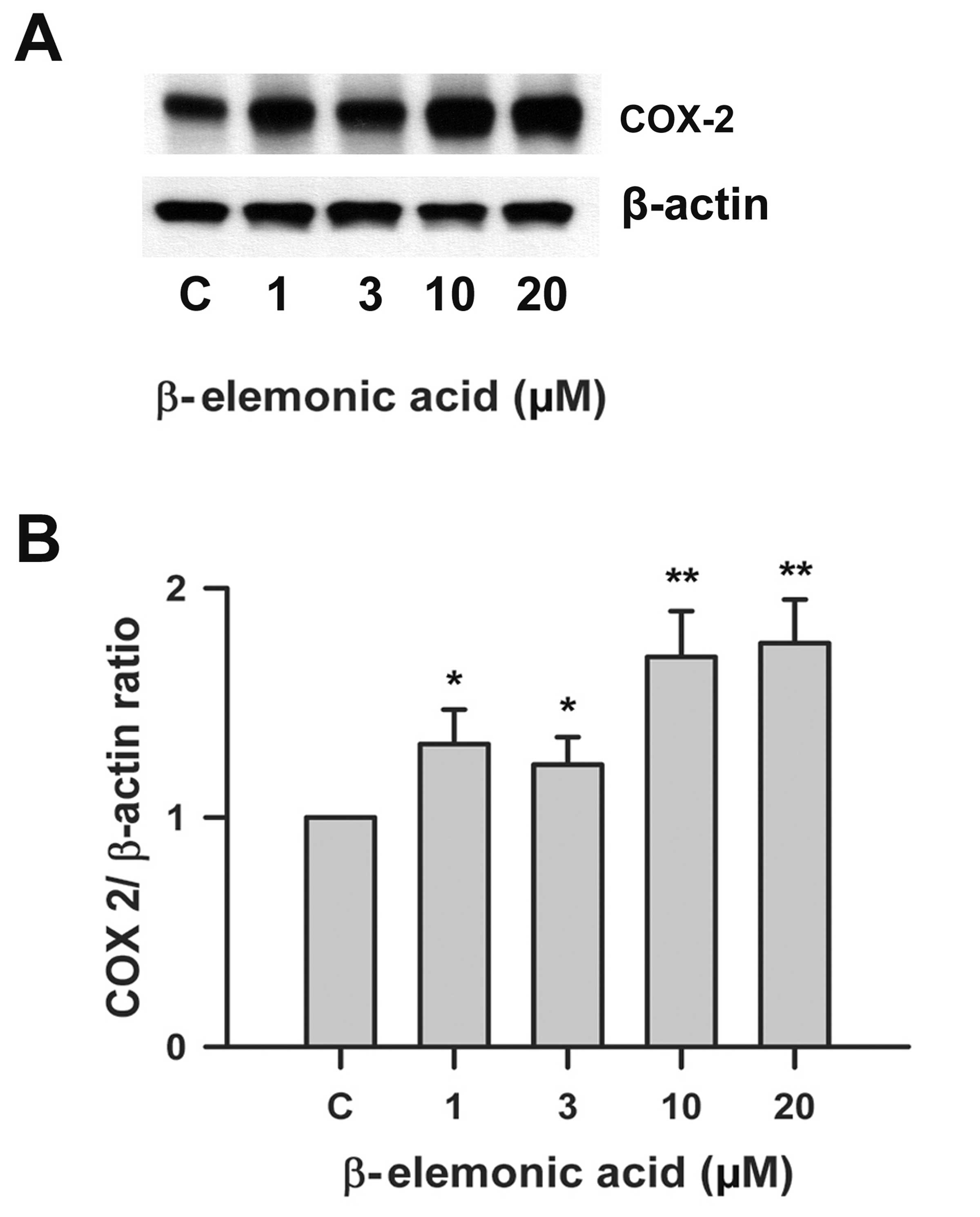 The results obtained in the present study provided profound evidence that β-elemonic acid exhibited oxidative injury in A549 cells. Using the DCFH-DA assay, the results revealed that β-elemonic acid induced ROS levels (Fig. 8). We examined the effects of β-elemonic acid on COX-2 expression in A549 cells, and the expression of COX-2 proteins was examined using western blot analysis. Fig. 9 indicates that the exposure of human lung A549 cells to 1-20 μM β-elemonic acid resulted in a marked increase in COX-2 expression. COX-2 protein was modulated in the β-elemonic acid-induced apoptosis in human lung A549 cells.