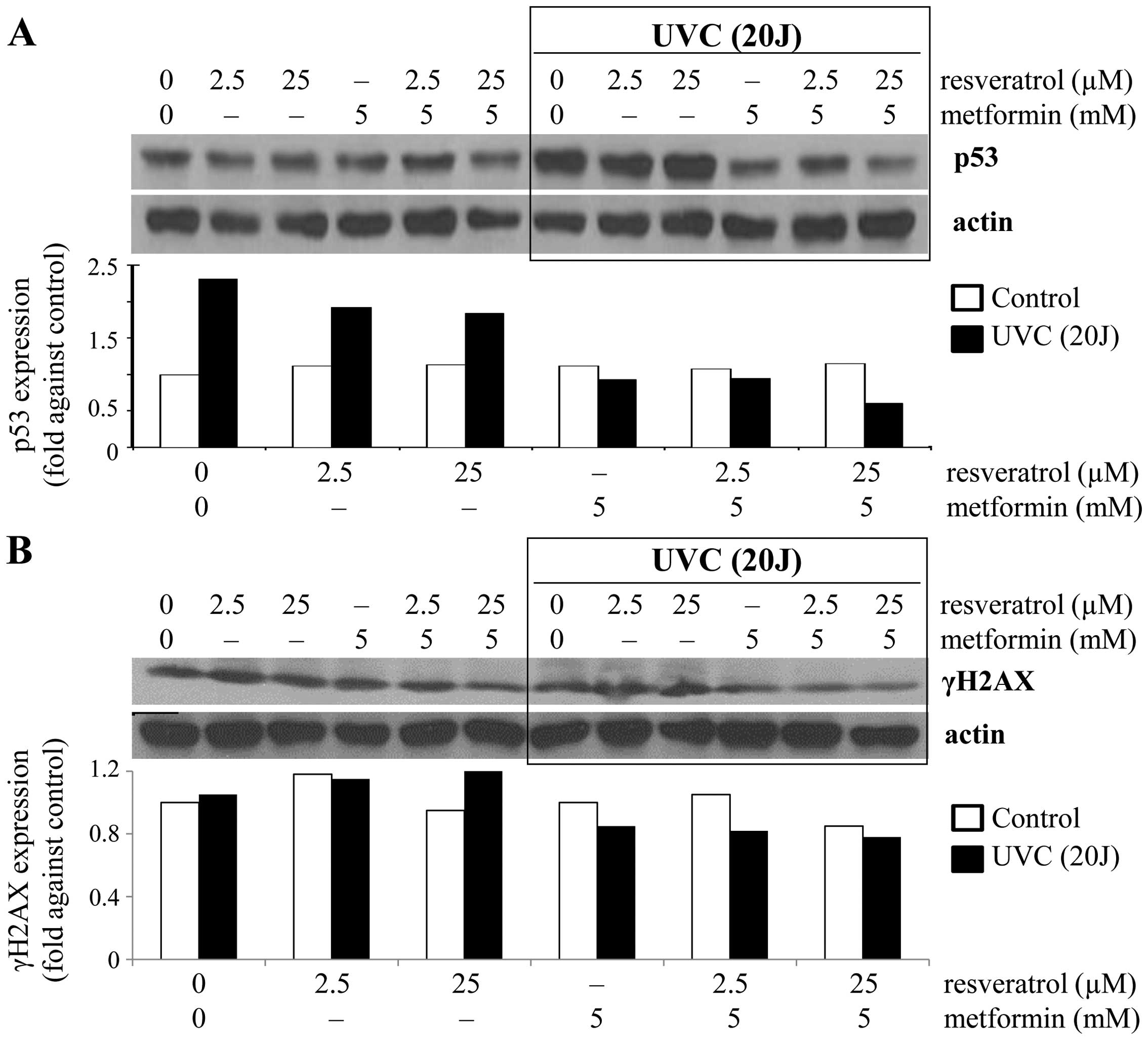 In the present study, we focused on the roles resveratrol and metformin play in modulating the cellular and molecular changes in cancer cells elicited in response to UV challenge using as a model UVC-stressed and unstressed A549 cells. Specifically, DNA damage responses by resveratrol and metformin were assessed using changes in the level of expression of p53 and γH2AX. Our results showed that metformin at 5 mM significantly prevented the UVC-induced upregulation of p53; relatively, much less inhibition on UVC-induced p53 expression was observed in cells treated with resveratrol (Fig. 1A). In addition, inhibition of UVC-induced γH2AX expression was only observed in metformin and not resveratrol treatment conditions (Fig. 1B). These findings suggest that metformin has better preventive potential against UVC-induced DNA damage compared to resveratrol.