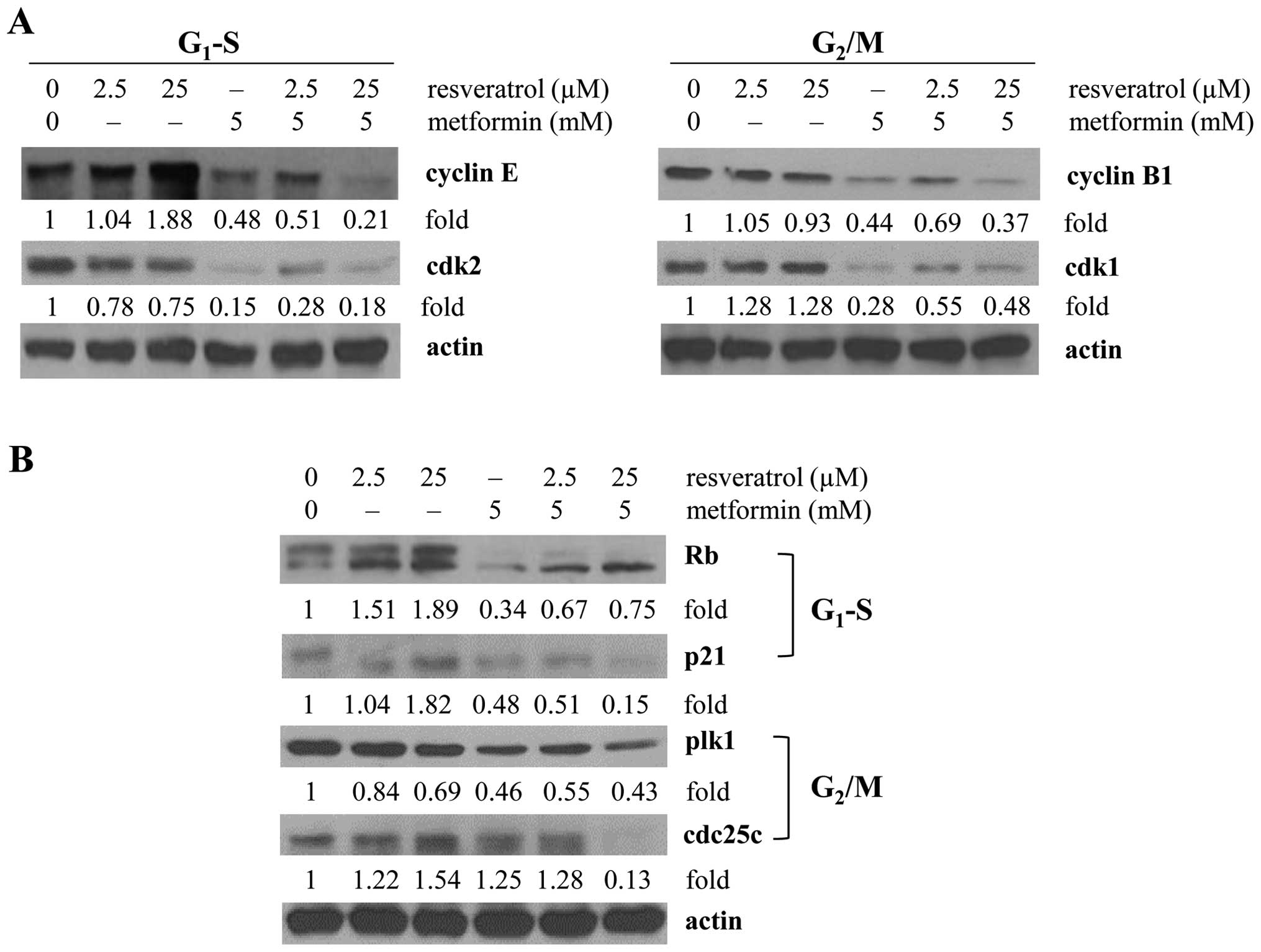 Fetal calf serum, Eagle's minimum essential medium, penicillin and streptomycin were purchased from Cellgro, Inc. (Herndon, VA, USA). Metformin (1,1-dimeth-ylbiguanide chloride) and resveratrol were obtained from Calbiochem (La Jolla, CA, USA) and LKT Laboratories (St. Paul, MN, USA), respectively. All other chemicals and solvents used were of analytical grade. Primary antibodies: p53, cyclin B1, cyclin E, cdk1, cdk2, Rb, p53R2, cdc25C, actin and secondary antibodies were purchased from Santa Cruz Biotechnology, Inc. (Santa Cruz, CA, USA). Other antibodies for the present study were obtained from the following sources: serine-139-phosphorylated histone H2AX (Upstate Biotechnology, Inc., Lake Placid, NY, USA); p21 (Cell Signaling Technology, Inc., Beverly, MA, USA); plk1 (Invitrogen Corp., Carlsbad, CA, USA), and p-chk2 (Cell Signaling Technology, Inc.). All other chemicals and solvents used were of analytical grade.