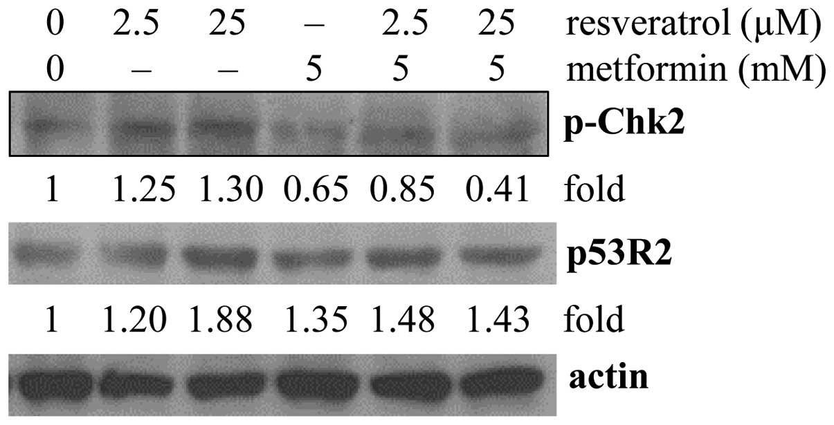 DNA repair plays an important role in DNA damage responses during anti-carcinogenesis and anti-aging. Two tumor suppressor proteins, checkpoint kinase 2 (Chk2) and p53R2, associated with DNA damage checkpoint and DNA repair were further analyzed in response to UVC. In cells treated with resveratrol, p-chk2 and p53R2 were upregulated (Fig. 3), suggesting the activation of DNA repair by resveratrol under UVC treatment as a cellular protective mechanism from DNA damage. Metformin alone or in combination with resveratrol also resulted in the upregulation of p53R2 (Fig. 3) while downregulation of p-chk2 was found in cells treated with metformin alone or combined with resveratrol (Fig. 3). These results suggest that in cells exposed to UVC, metformin alone or with addition of resveratrol likely induces DNA repair via the upregulation of p53R2 without concomitantly invoking the activation of chk2.
