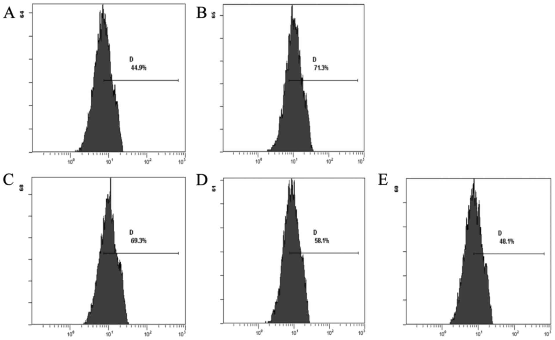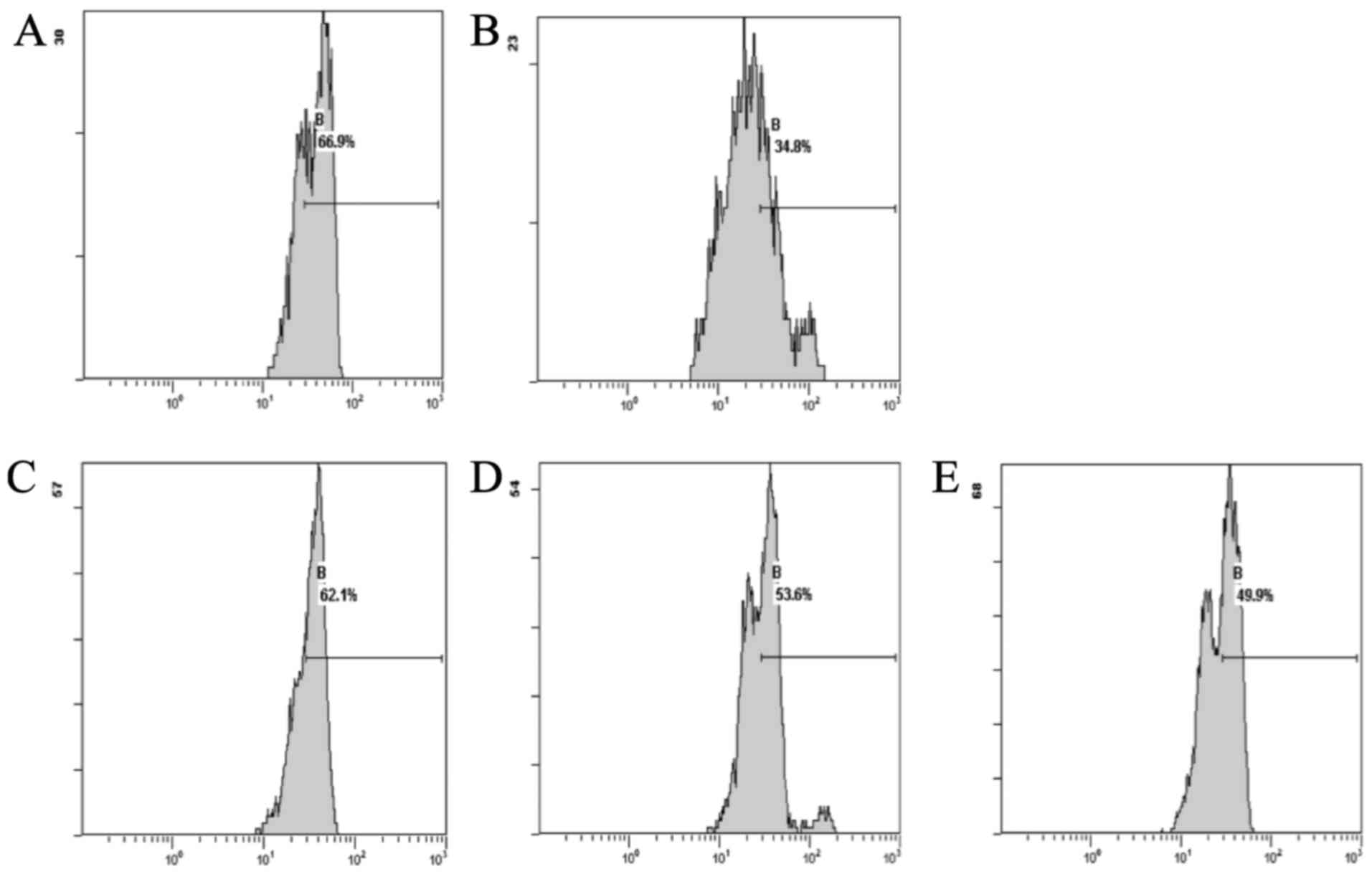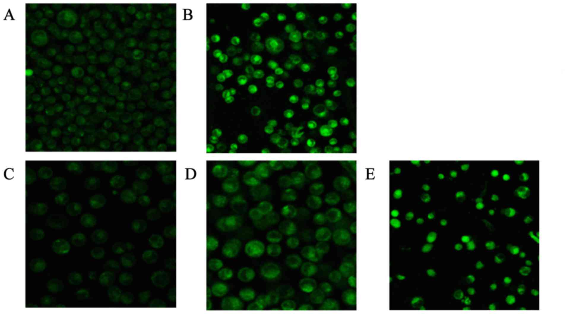 Detection of ROS using FCMHepG2 cells in the logarithmic growth phase were inoculated in 6-well plates. After 24 h, 1 ml of the drugs was added to each hole (the doses same as above). After 48 h, the cells were collected and suspended in DCFH-DA (diluted 1:1,000 with RPMI-1640 without serum, the final concentration was 10 µmol/l). Then, the cells were incubated for 1 h at 37°C and the cells were washed three times with RPMI-1640 without serum. After filtration with 300 mesh strainer, the cells were analyzed by FCM (35).