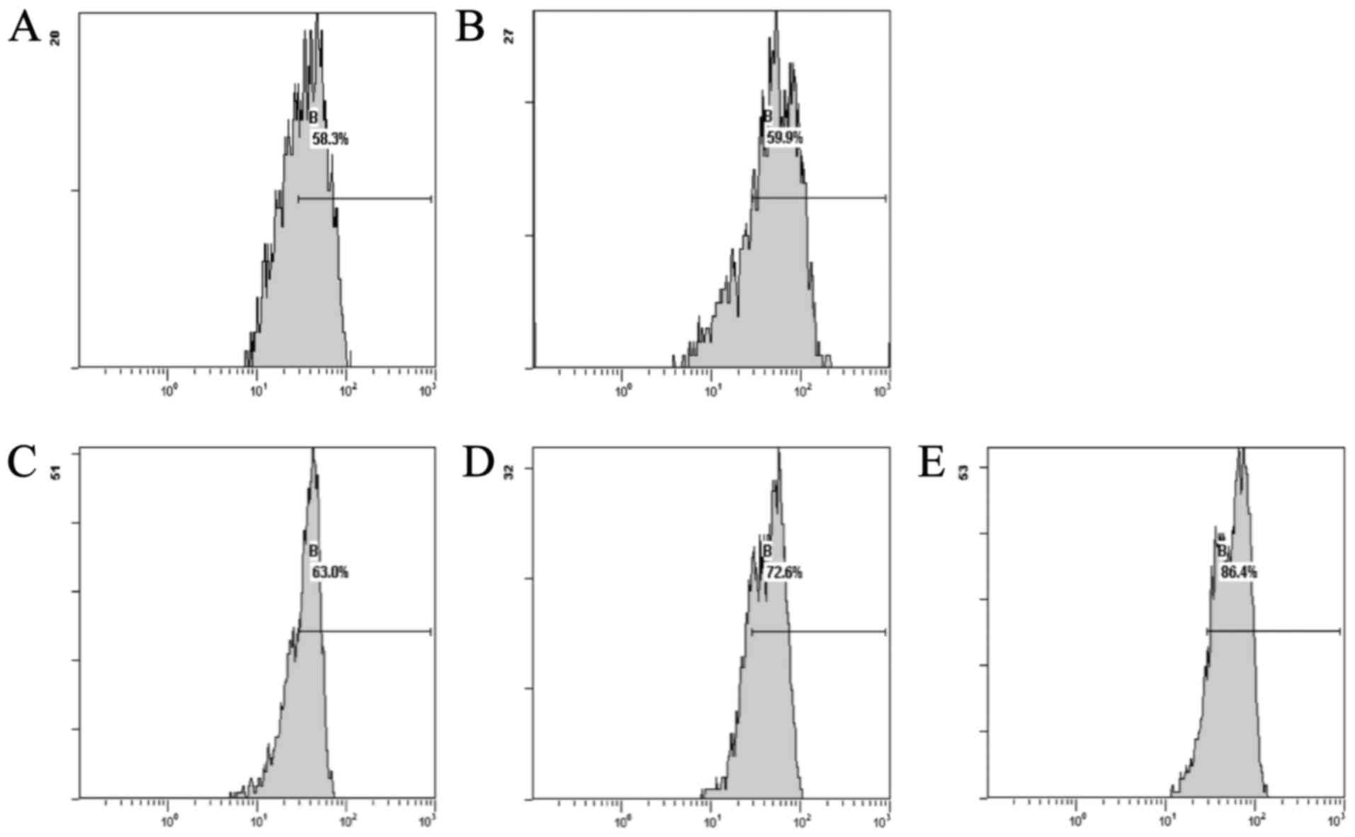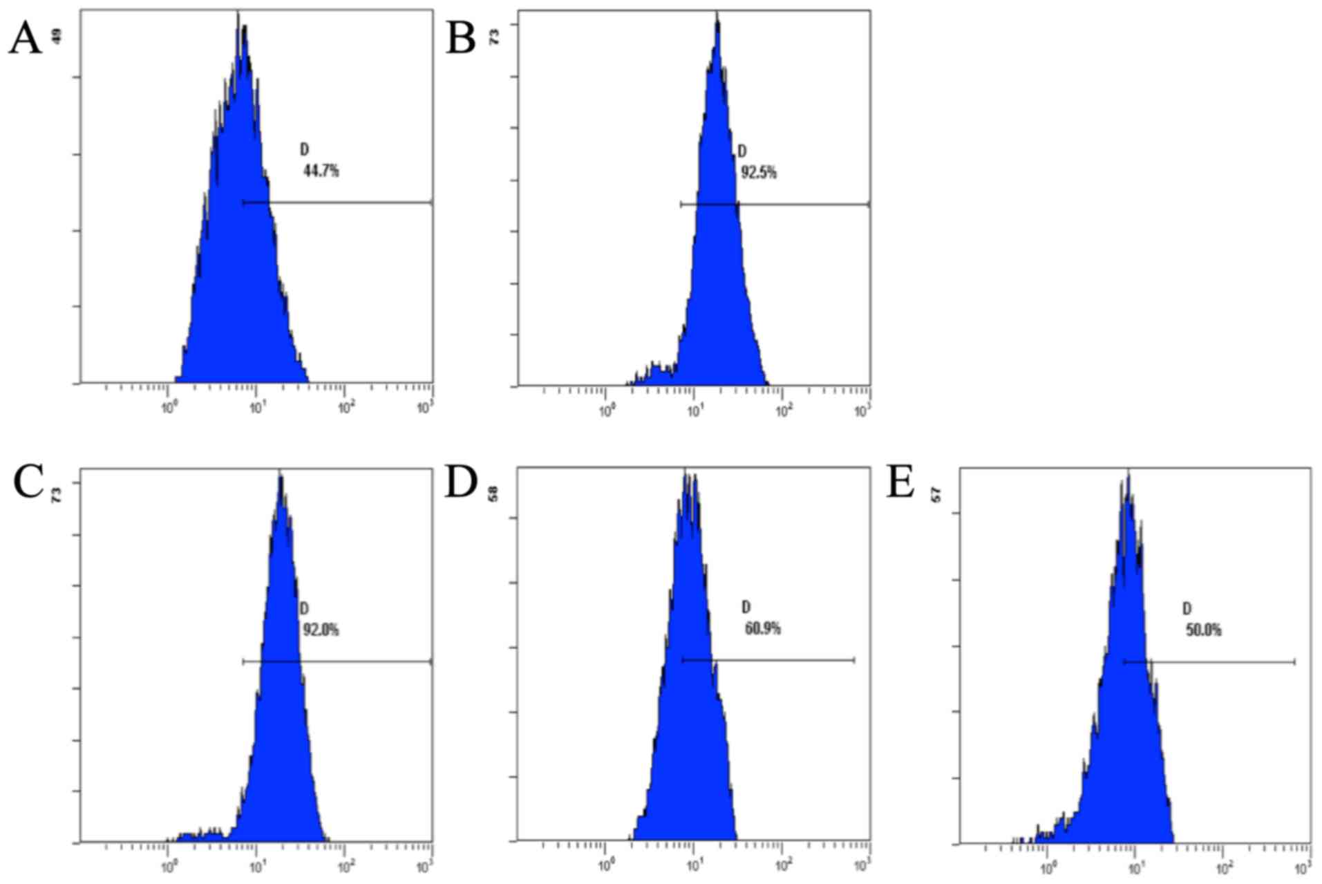 Statistical analysisDifferences in proliferation between different groups were analyzed using one-way ANOVA. Statistical analysis was performed using SPSS 19.0 software. P<0.01 was considered to indicate a statistically significant difference. The results are expressed as mean ± SD.