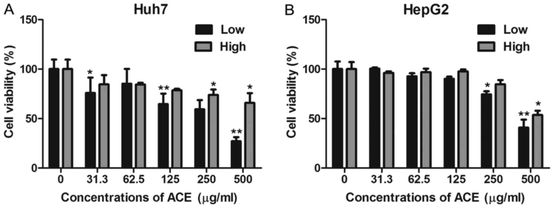 Anti-proliferative effects of ACE on HCC cells were analyzed using the 3-(4,5-dimethylthiazol-2-yl)-2,5-diphenyltetrazolium bromide (MTT) assay. Huh7 and HepG2 cells were treated with increasing concentrations of ACE for 72 h followed by further incubation with the MTT-containing medium for 4 h. After lysis with dimethyl sulfoxide, the absorbance of lysates was determined at 570 nm by using a microplate reader.