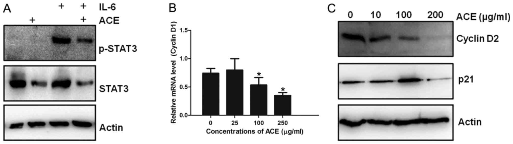 The effect of ACE on the phosphorylation status of STAT3 was analyzed by immunoblotting. HepG2 cells were treated with ACE for 3 h prior to treatment with IL-6 (25 ng/ml). After incubation for 25 min, the cells were lysed and the cell lysates were subjected to immunoblotting using anti-STAT3 (Santa Cruz Biotechnology, sc-482), anti-phosphoSTAT3 (Cell Signaling, #9131), and anti-β-actin antibodies (Santa Cruz Biotechnology, sc-47778). To analyze the effect of ACE on the expression of cyclin D2 and P21, HepG2 cells were treated with ACE for 48 h and subjected to immunoblotting using anti-cyclin D2 (Santa Cruz Biotechnology, sc-593) and anti-P21 (Santa Cruz Biotechnology, I2807) antibodies.