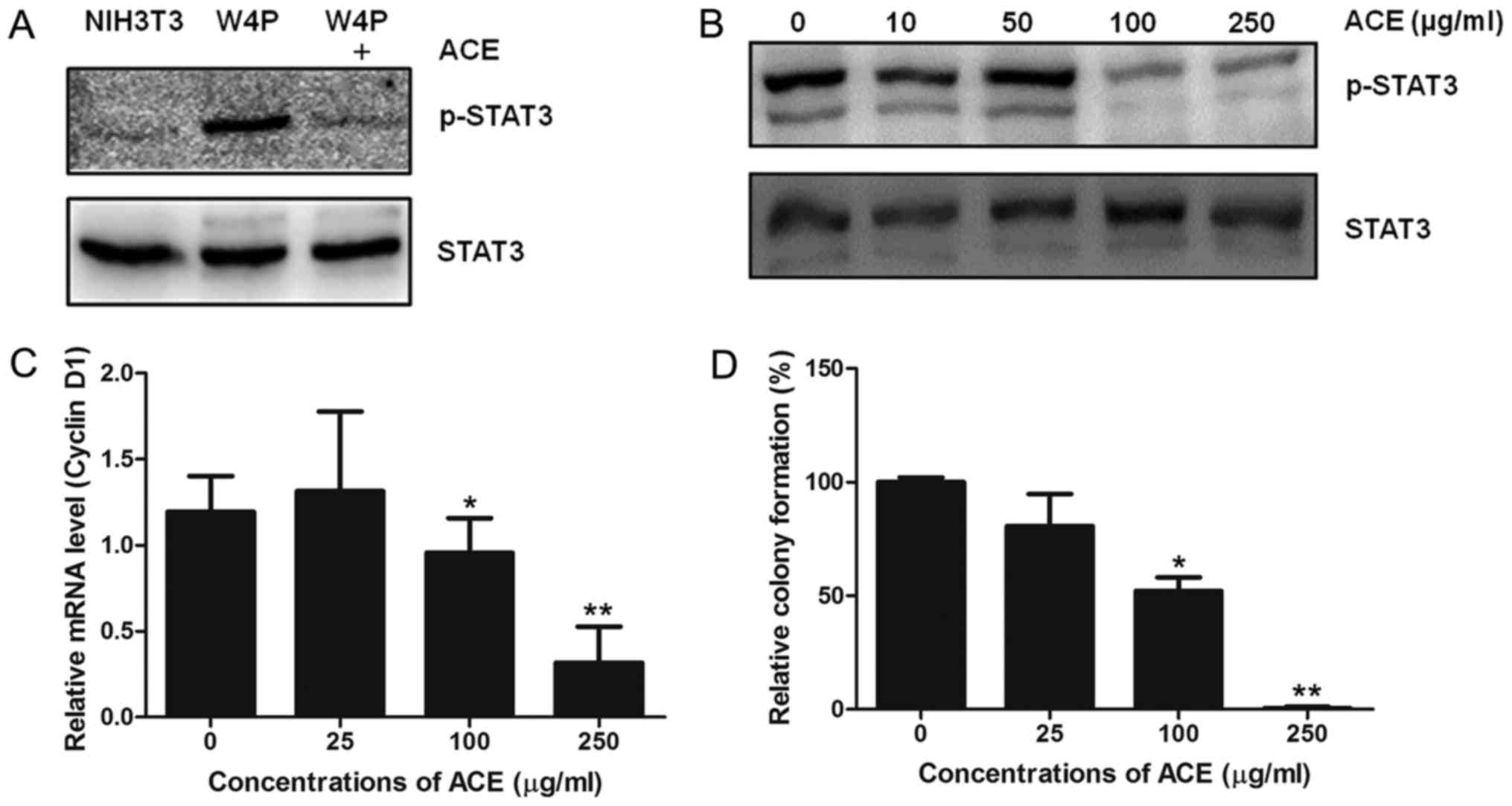 In our previous study, we showed that male-specific W4P mutant HBV LHB drives HCC tumorigenesis by activating the IL-6/STAT3 signaling pathway (4). Thus, we evaluated whether ACE suppresses the STAT3 activation induced by W4P LHB. NIH3T3 cells stably expressing W4P LHB (NIH3T3-W4P) showed strong STAT3 phosphorylation compared to control NIH3T3 cells and the phosphorylation was decreased by ACE (Fig. 4A). The activity of ACE was dose-dependent and 100 µg/ml of ACE was sufficient to lower the phosphorylation to significant extent (Fig. 4B). In line with the results, cyclin D1 mRNA level of NIH3T3-W4P was also decreased in a dose-dependent manner by ACE treatment, further confirming that ACE suppresses the transcriptional activity of STAT3 (Fig. 4C). It has been shown that W4P LHB confers in vitro colony forming ability and in vivo tumor forming capability in nude mice to NIH3T3 cells by activating the STAT3 signaling pathway (4). Since ACE suppresses STAT3 activation in NIH3T3-W4P cells, we evaluated whether ACE suppresses the colony-forming capability of NIH3T3-W4P cells. As shown in Fig. 4D, ACE treatment decreased the number of colonies in a dose-dependent manner, and 250 µg/ml of ACE almost completely abolished the colony-forming ability of NIH3T3-W4P cells. These results suggest that ACE is capable of suppressing tumorigenesis induced by HBV mutations and subsequent inflammatory responses including STAT3 activation in addition to HCC cell proliferation.