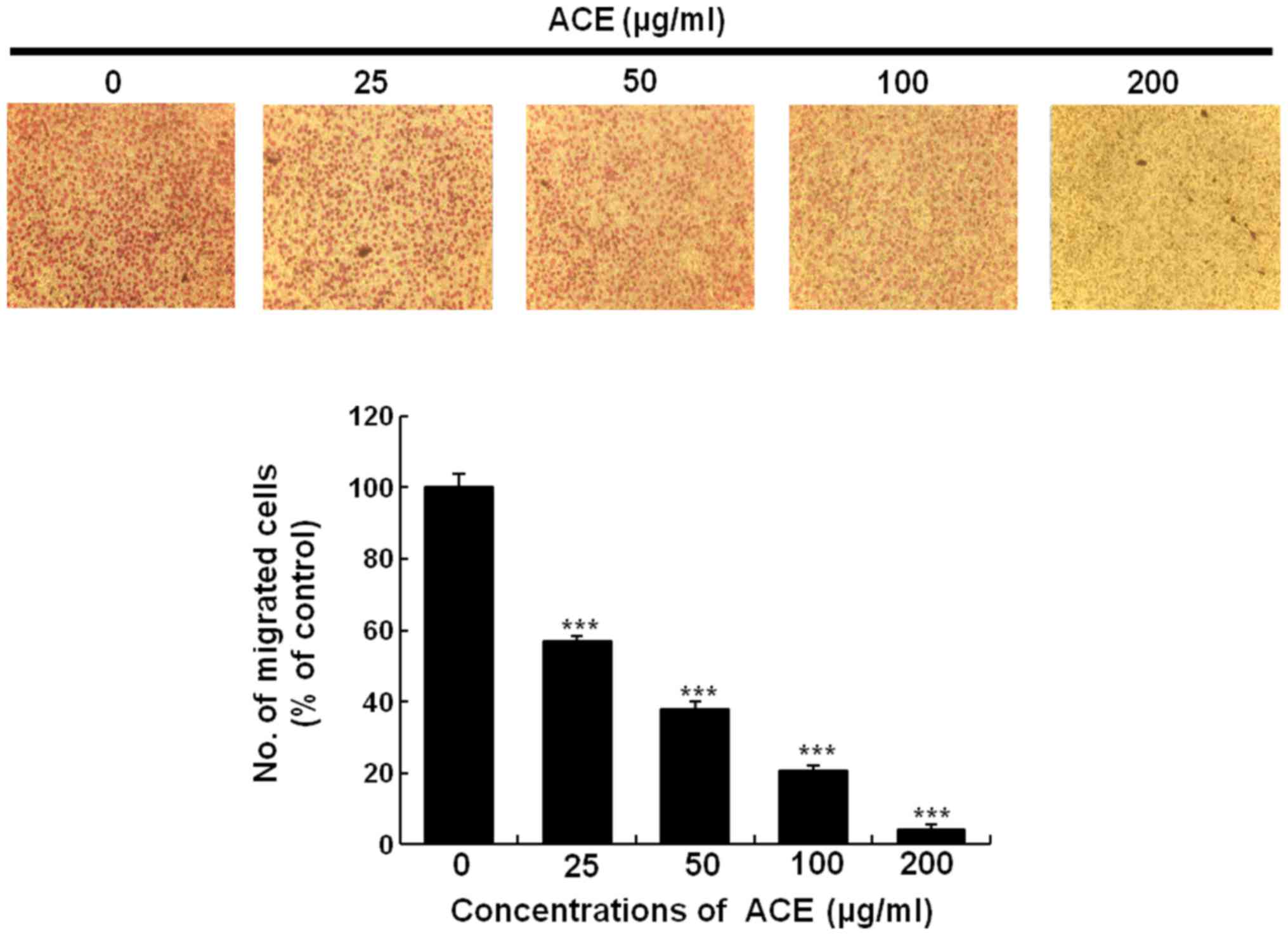 Cell migration assay was performed as previously described (25). Briefly, after being treated with ACE (0, 25, 50, 100, and 200 µg/ml) for 24 h, Huh7 cells were harvested and seeded on a Boyden chamber (Neuro Probe, Cabin John, MD, USA) at a density of 105 cells per well in a serum-free medium and then incubated for 6 h at 37°C. The migrated cells were fixed with 100% methanol and stained with 5% Giemsa. Cells were counted under a light microscope.