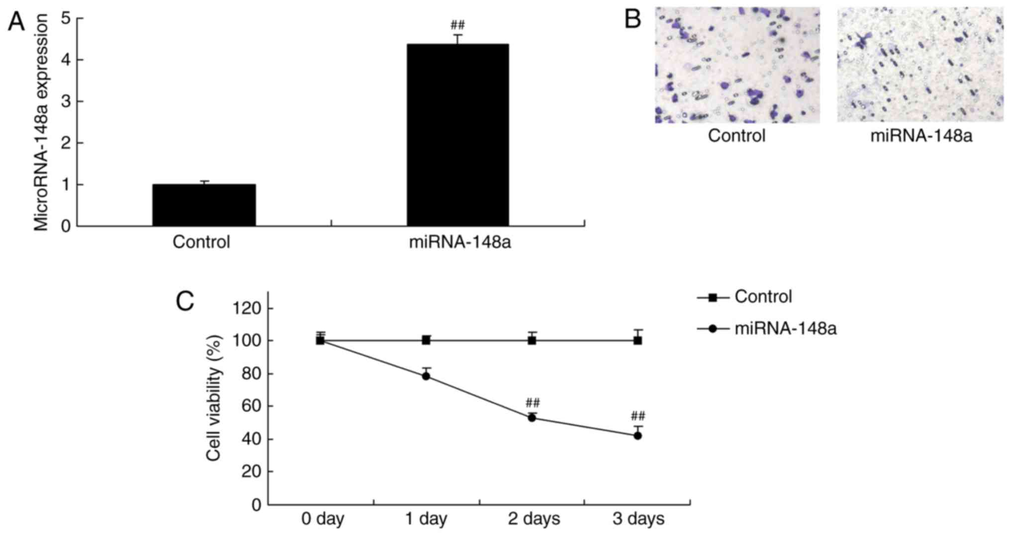 miRNAs are a class of non-coding single-stranded small RNA molecules with the length of 19–23 nucleotides, which locate in the non-coding region of the genome (3). miRNAs, which are highly conserved in evolution, can regulate gene expression at translation level. Moreover, they can participate in multiple physiological metabolic processes, including development, cell differentiation, cell apoptosis, and cell energy metabolism (5). With the advancement in research on molecular biology and molecular genetics, increasing studies have demonstrated that miRNAs are related to tumor genesis, development, metastasis and prognosis (5). Feng et al showed that microRNA-148a suppressed cell proliferation and migration of pancreatic cancer cells (6). Zhang et al showed that microRNA-148a suppressed cell proliferation and invasion potential through regulation of STAT3 in non-small cell lung carcinomas (7).