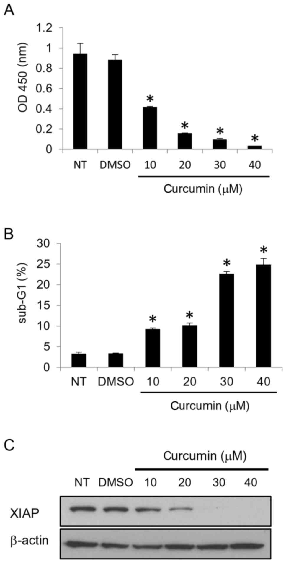 Previous studies have identified that XIAP is strongly expressed in breast cancer tissues (16,17). In order to elucidate the mechanisms responsible for the overexpression of XIAP, we searched for compounds that downregulate XIAP in breast cancer cells. Curcumin, one of the most common polyphenols, inhibited the growth of the MCF-7 breast cancer cells (Fig. 1A) and induced apoptosis (Fig. 1B). We then found that curcumin downregulated the XIAP protein (Fig. 1C). These results indicate that curcumin reduces the protein levels of XIAP in the MCF-7 breast cancer cells.