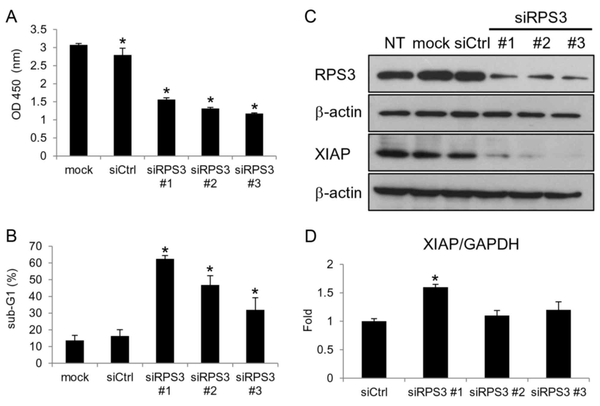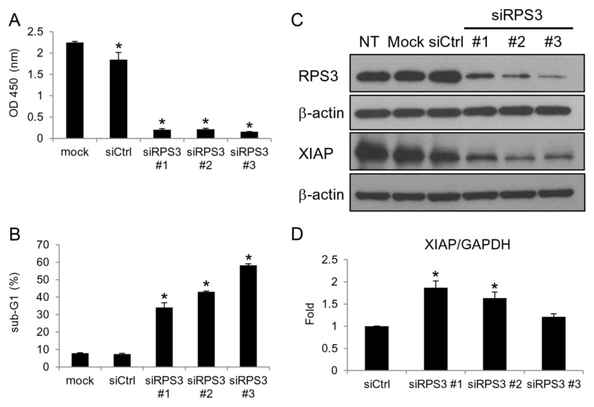 Additionally, in order to confirm that RPS3 regulates the expression of XIAP independently of the NF-κB signaling, we used another breast cancer cell line, MDA-MB-231. This cell line is classified as triple-negative breast cancer, which is the most aggressive subtype (30,31) and the NF-κB pathway is activated in this cell line (26). Similar to the MCF-7 breast cancer cells, the knockdown of RPS3 inhibited the cell growth (Fig. 4A) and induced apoptosis (Fig. 4B). The RPS3 depletion downregulated the XIAP protein (Fig. 4C), but not the mRNA level of XIAP in the MDA-MB-231 cells (Fig. 4D). Collectively, these results clearly reveal that RPS3 regulates the expression of XIAP independently of the NF-κB pathway in breast cancer cells, which is inconsistent with a previous study (21).