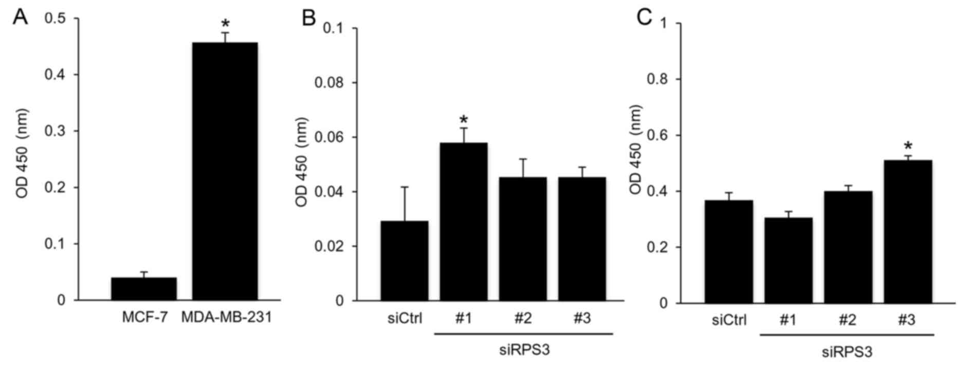 The MCF-7 and MDA-MB-231 cells were transfected with each siRNA using Lipofectamine RNAiMAX (Life Technologies, Carlsbad, CA, USA). The following siRNAs (Life Technologies) were used: siRPS3 #1 (HSS184418), 5′-GAGCUGGCUGAAGAUGGCUACUCUG-3′; siRPS3 #2 (HSS184419), 5′-GCGGAUUCGGGAACUGACUGCUGUA-3′; siRPS3 #3 (HSS184420), 5′-UGAUCCACAGCGGAGACCCUGUUAA-3′; and negative control siRNAs (cat. no. 12935-112 and no. 12935-115). Only RNA sequences of sense strands are shown.