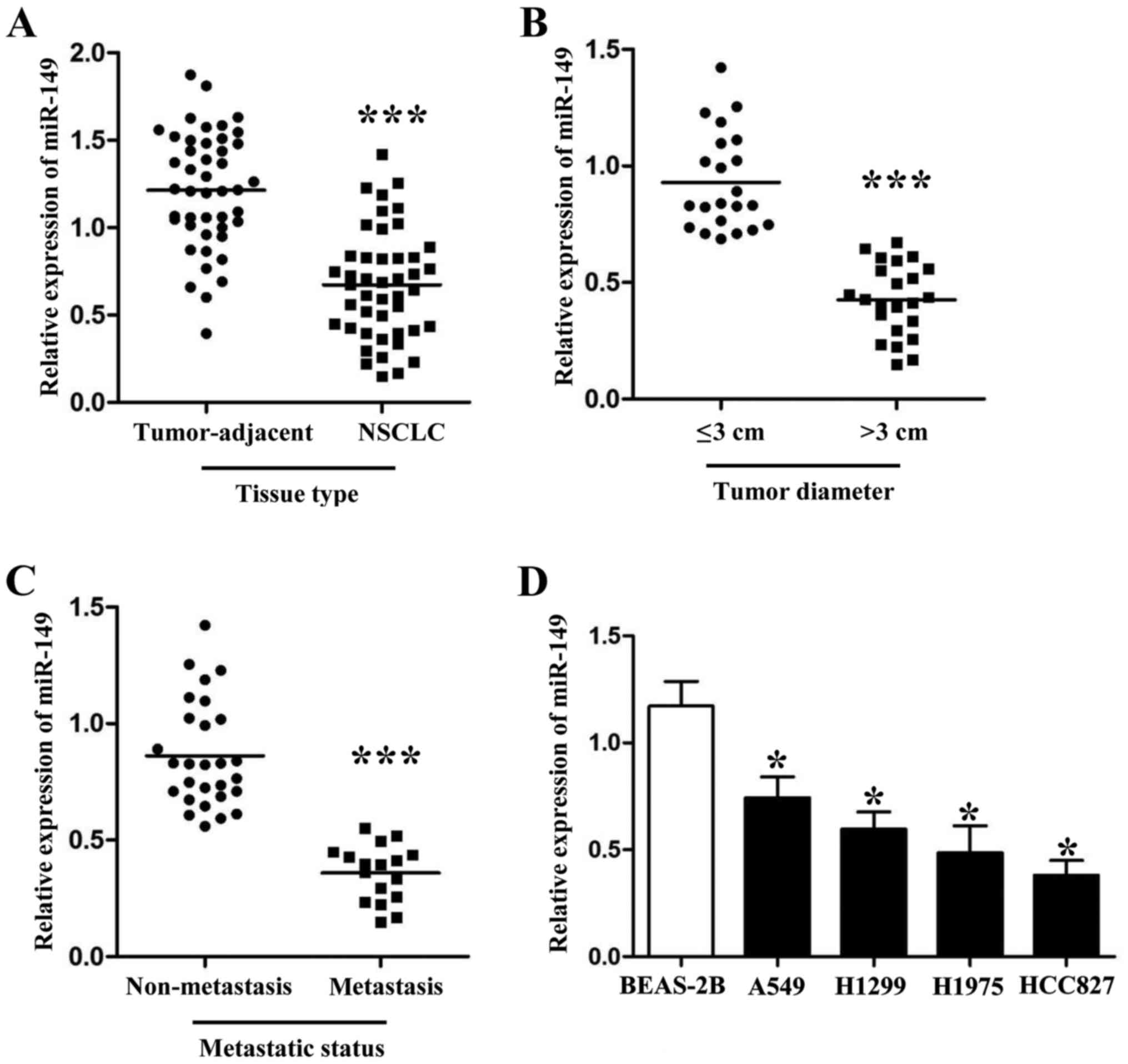 qRT-PCR was used to detect the expression levels of miR-149 in cancer tissues and different NSCLC cell lines. As shown in Fig. 1A, the expression levels of miR-149 were downregulated in the NSCLC tissues (Fig. 1A; P<0.001). Furthermore, we also divided these 45 patients into different subgroups according to their clinical features. As shown in Fig. 1B and C, PCR results revealed that patients with large tumor size and metastasis had lower miR-149 expression levels than those who did not have these malignant features (P<0.001, respectively). Next, compared with normal lung epithelium cells, we also found that miR-149 was downregulated in 4 NSCLC cell lines (A549, H1299, H1975 and HCC827; Fig. 1D; P<0.05, respectively).