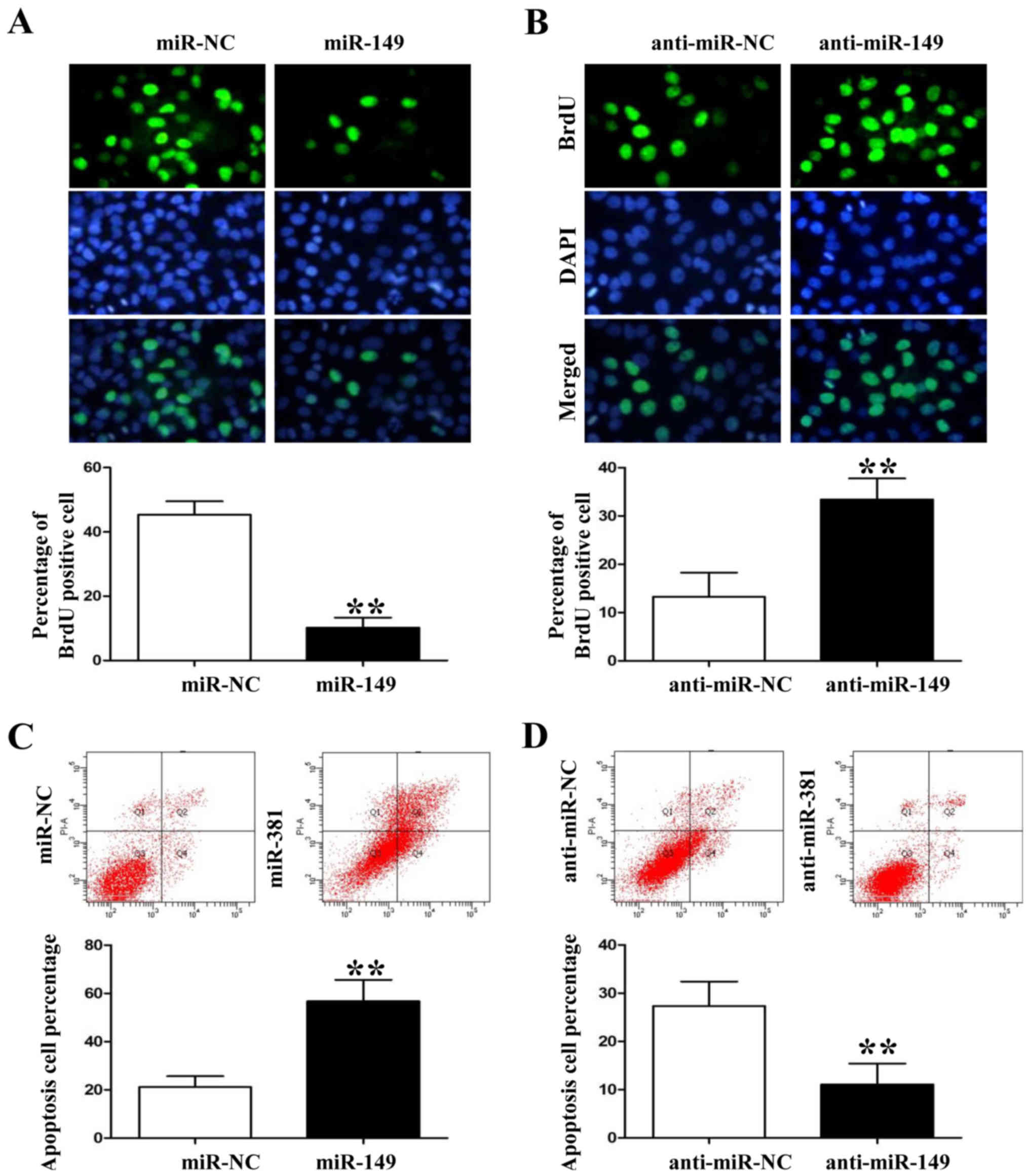 Following the analysis of expression levels of miR-149 in the 4 NSCLC cell lines, we used miR-149 lentivirus to overexpress its expression level in HCC827 cells and the anti-miR-149 lentivirus to knock down its expression level in A549 cells (P<0.05, data not shown). Anti-BrdU assay showed that miR-149 overexpression significantly decreased the number of BrdU-positive staining HCC827 cells (Fig. 3A; P<0.01). However, miR-149 knockdown induced A549 cell proliferation based on the BrdU immunofluorescence results (Fig. 3B; P<0.01). In contrast, flow cytometric assay showed that miR-149 overexpression increased the percentage of apoptotic HCC827 cells whereas miR-149 knockdown decreased A549 cell apoptosis (Fig. 3C and D; P<0.01, respectively).