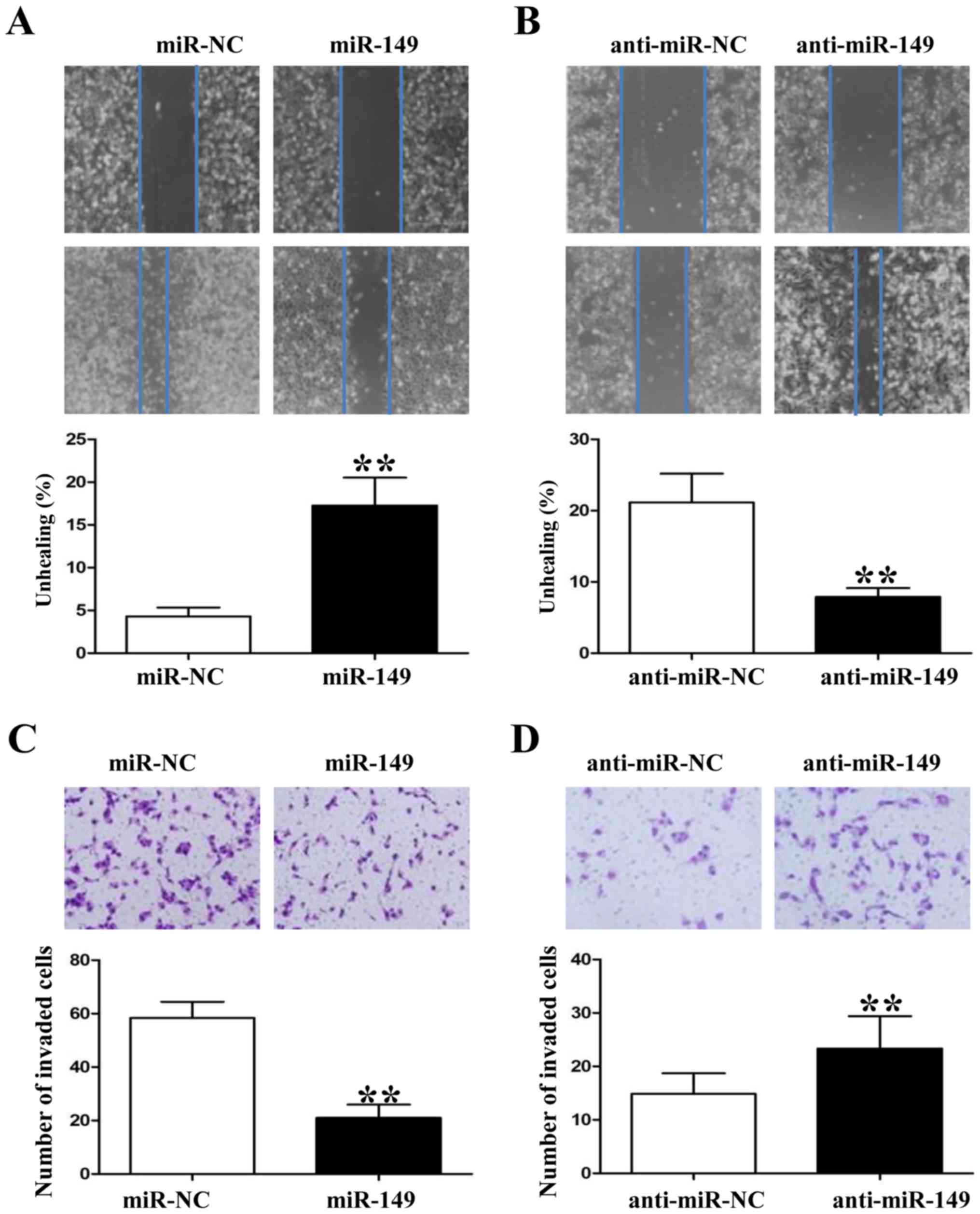 Since miR-149 was found to be associated with tumor metastasis in clinical samples, we also used wound healing and Transwell assays to demonstrate that upregulation of miR-149 impaired the migration and invasion of HCC827 cells (Fig. 4A and C; P<0.01, respectively). In contrast, downregulation of miR-149 in A549 cells enhanced their migration and invasion markedly (Fig. 4B and D; P<0.01, respectively). In summary, these data suggest that miR-149 attenuates the metastatic ability of NSCLC cells.