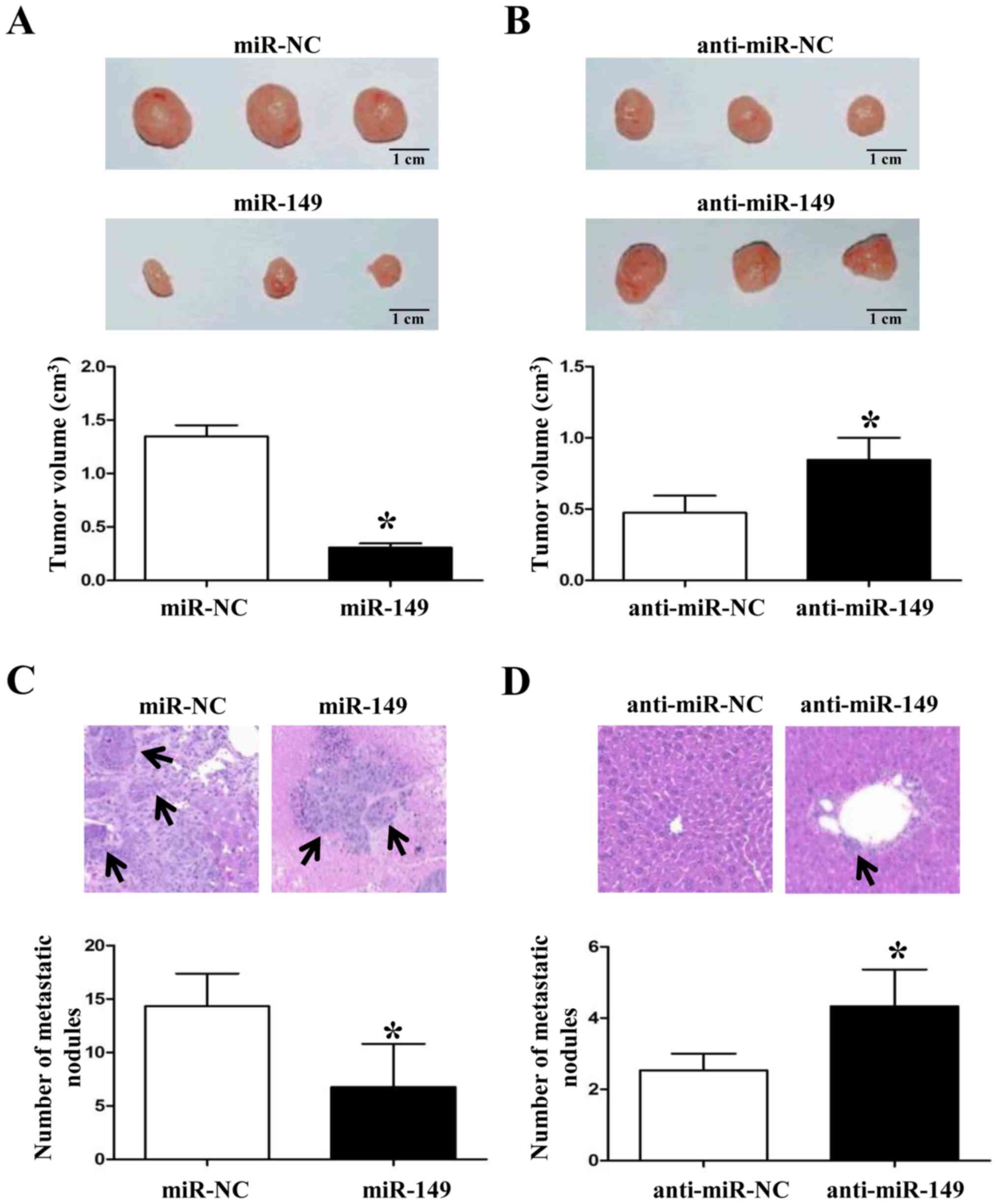 Functionally, we used gain- and loss-of-function experiments to confirm that miR-149 inhibited NSCLC cell proliferation, migration and invasion in vitro and it also inhibited subcutaneous xenograft growth and liver metastasis in vivo. These results were consistent with the expression levels of miR-149 in the clinical samples.