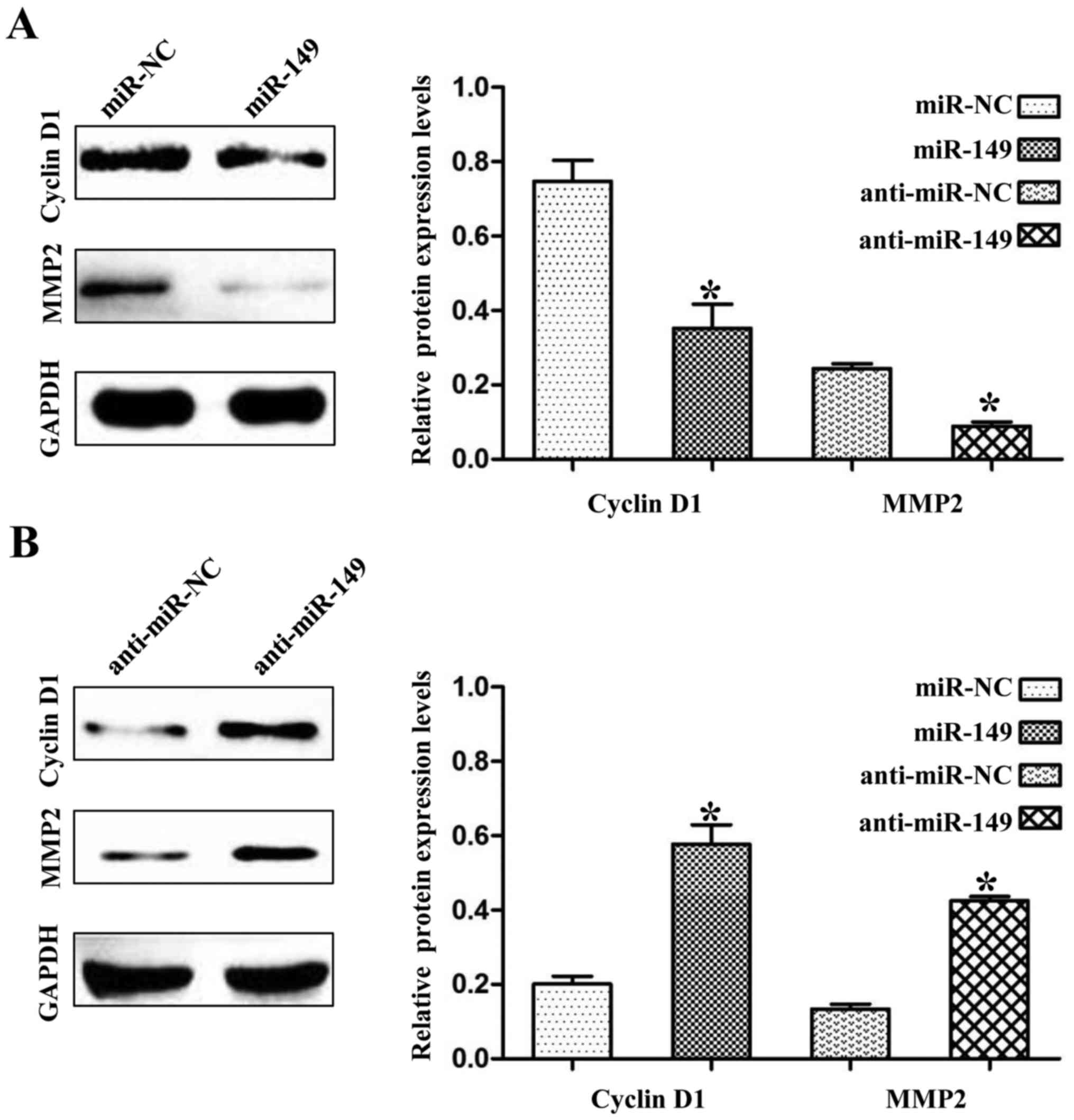Forkhead box protein M1 (FOXM1) is a member of the FOX family of transcription factors. In NSCLC, FOXM1 has been demonstrated as a tumor inducer due to its function in tumor proliferation (15), invasion (16) and chemoresistance (17). Moreover, FOXM1 was found to be a target of several miRNAs in NSCLC such as miR-134 (18) and miR-509 (19). In the present study, we found that FOXM1 may be a target of miR-149. To confirm their relationship, we used PCR, western blot and luciferase reporter assays to demonstrate that miR-149 inhibited FOXM1 mRNA and protein expression levels by binding to its 3′-UTR in NSCLC cells. Moreover, patients with low expression levels of miR-149 exerted high FOXM1 mRNA levels. As a classical oncogenic transcription factor in NSCLC, FOXM1 could enhance the transcription of many oncogenes including cyclin D1 and MMP2 in lung cancer (11,20,21). In addition, we also found that miR-149 decreased the expression levels of cyclin D1 and MMP2 in NSCLC cells.