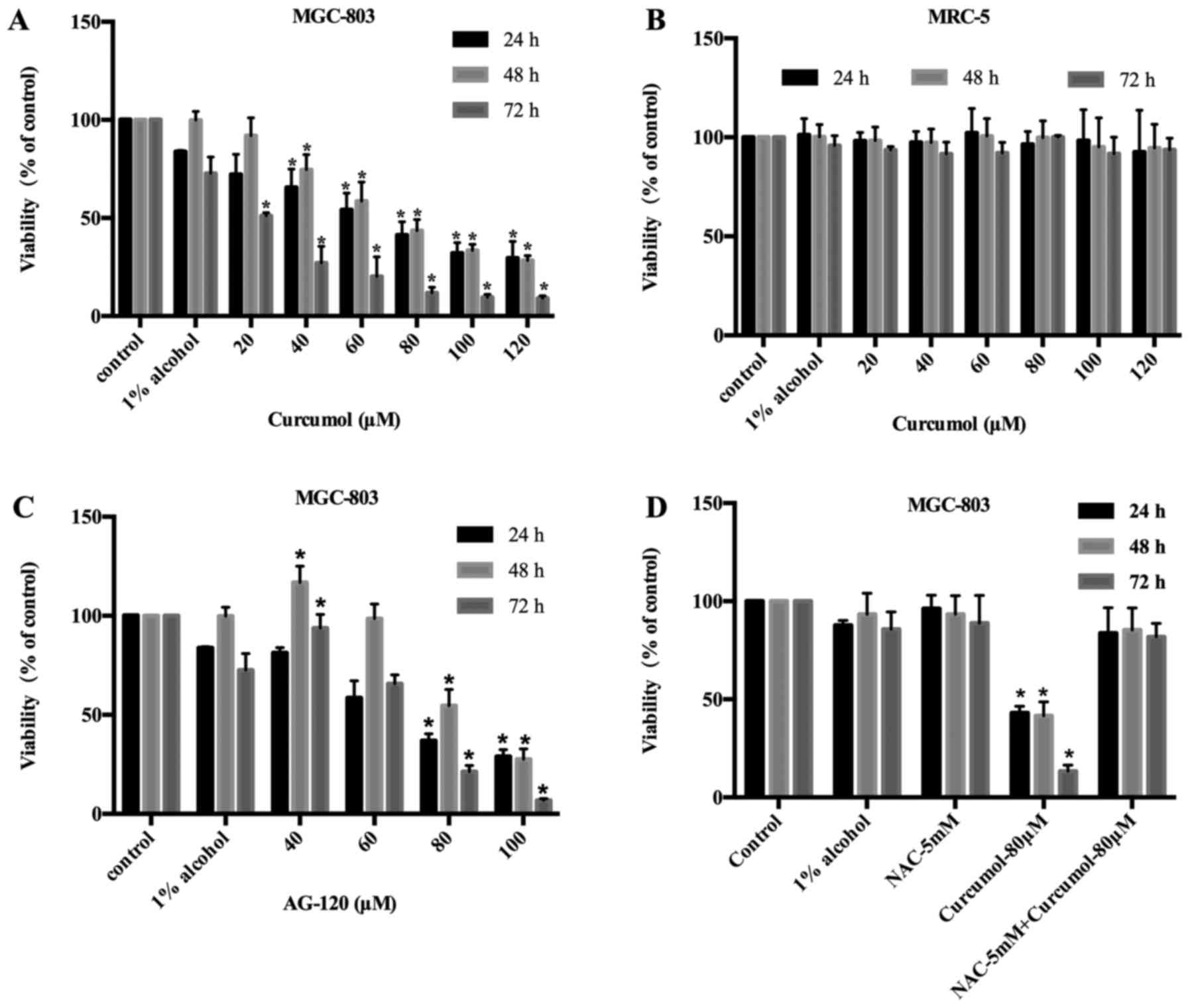 Cell viability was detected by MTT assay. The MGC-803 and MRC-5 cells were cultured in 96-well plates at a density of 3×103 cells/100 µl/well. After incubation for 24 h, the cells were treated with: DMEM culture medium, 1% alcohol (DMEM culture medium with 1% alcohol) and curcumol at concentrations of 20, 40, 60, 80, 100, and 120 µM or AG-120 at concentrations of 40, 60, 80 and 100 µM for different time-points, including 24, 48 and 72 h. NAC was used to detect whether curcumol inhibited cell proliferation by increasing ROS. The cells were treated with the control (DMEM culture medium), 1% alcohol (DMEM culture medium with 1% alcohol), curcumol (80 µM), NAC (5 mM), curcumol (80 µM) + NAC (5 mM) for 24, 48 and 72 h. Then 10 µl of 0.5 mg/ml MTT were added to each well and the mixture was cultured at 37°C for an additional 4 h. Subsequently the culture medium was replaced with 100 µl DMSO to dissolve the formazan crystals. After shaking for 10 min, the absorbance of each well was determined at 570 nm by a plate reader (Bio-Rad Laboratories, Inc., Hercules, CA, USA). Five replicate wells were designed for each sample. This experiment was repeated three times and the cell viability was calculated as follows: cell viability rate (%) = (experimental OD value - zero set OD value)/(control OD value - zero set OD value) × 100. The 50% inhibitory concentration (IC50) was calculated by GraphPad Prism 6 (GraphPad Software Inc., La Jolla, CA, USA).