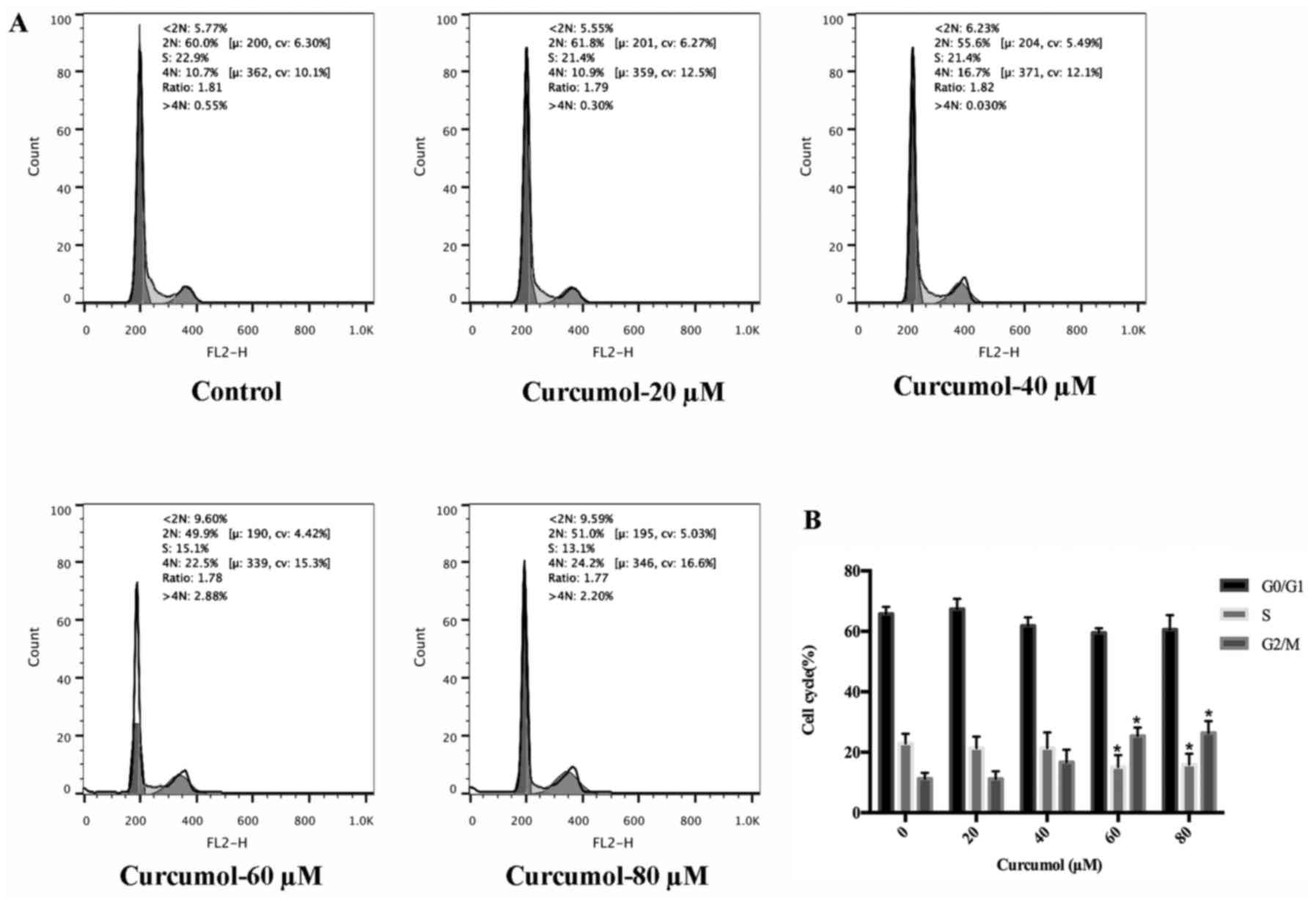 After curcumol was confirmed to inhibit MGC-803 cell growth, we next examined whether the growth inhibitory effect of curcumol was related to cell cycle arrest. PI staining followed by FACS analysis demonstrated the effect of curcumol on cell cycle progression in MGC-803 cells. MGC-803 cells treated with curcumol at 60 and 80 µM resulted in a small accumulation of cells in the G2/M phase and a decrease in the S-phase cell population. This result revealed a G2/M phase cell cycle arrest of gastric cells upon exposure to curcumol (Fig. 4). However the cycle arrest of curcumol was not statistically significant.