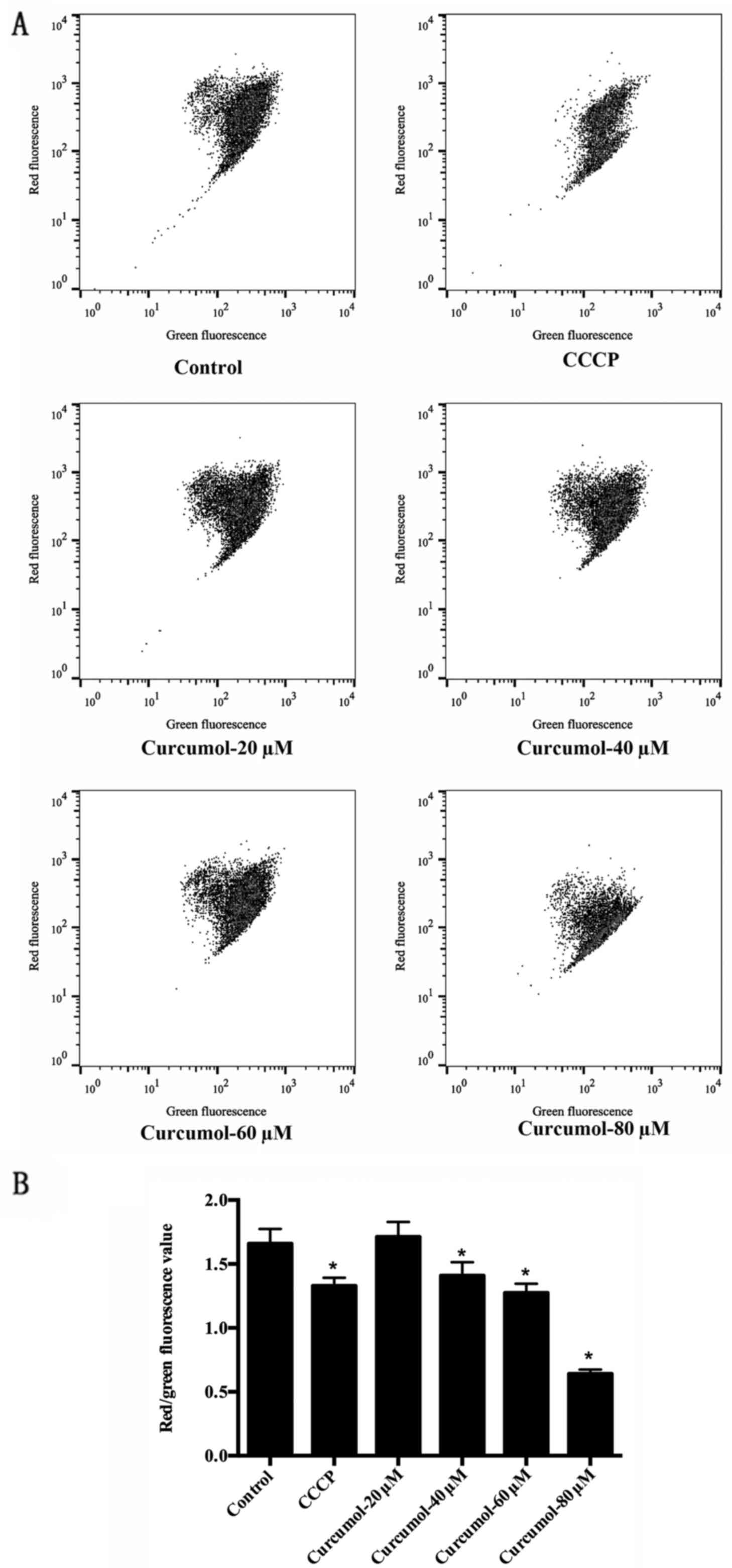 The MMP assay was performed to evaluate the level of the polarization/depolarization of the mitochondrial membrane using the JC-1 dye. MGC-803 cells were treated with curcumol (0, 20, 40, 60 and 80 µM) at a density of 1×105 cells/well in a 6-well plate. After 24 h, the cells were collected and stained using JC-1 according to the manufacturer's instructions. Finally, the cells were analyzed on a flow cytometer and the results were analyzed using FlowJo software.