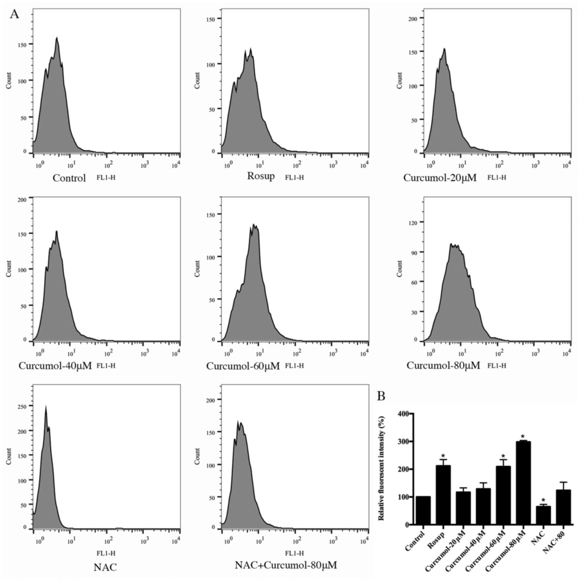 It has been confirmed that excess ROS promotes cell death and curcumol upregulates ROS to induce apoptosis in tumors (16). Thus, we further examined the effects of curcumol on ROS production in MGC-803 cells. The level of ROS in the MGC-803 cells was assessed using the DCFH-DA probe and flow cytometry in the FL1-H channel (Fig. 6A). The result revealed that the level of ROS increased significantly after treatment with curcumol for 24 h at concentrations of 60 or 80 µM (p<0.05). NAC was capable of decreasing the increase in ROS caused by curcumol. Rosup treated cells were used as a positive control (Fig. 6B).