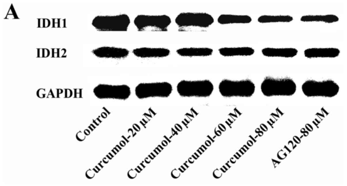 MGC-803 cells were cultured in a 6-well plate at a density of 2×105 cells/well with different curcumol concentrations, including 0, 20, 40, 60 and 80 µM. AG-120 (80 µM) treatment was used as a positive control. After 48 h, the cells were collected in lysis buffer and incubated on ice for 20 min. The lysates were centrifuged at 4°C for 20 min and then the supernatant was transferred to a new 1.5-ml test tube. To ensure the equal loading of protein (40 µg) for each group, protein quantification (Thermo Fisher Scientific, Waltham, MA, USA) was performed to detect the total protein. Then the samples were separated by 10% sodium dodecyl sulfate polyacrylamide gel electrophoresis (SDS-PAGE) and were transferred to polyvinylidene fluoride (PVDF) membranes. Next the membranes were blocked with 5% skim milk for 1 h at room temperature. Subsequently, the membranes were washed in TBST and incubated with antibodies of GAPDH (1:1,000 dilution), IDH1 (1:5,000 dilution) and IDH2 (1:2,500 dilution) overnight at 4°C. On the second day, the membranes were washed in TBST and then incubated at room temperature for 1 h with the appropriate secondary antibody (goat anti-mouse IgG for GAPDH and goat anti-rabbit IgG for IDH1 and IDH2). The bands were visualized using an enhanced chemiluminescence (ECL) system (Thermo Fisher Scientific) and Kodak XBT-1 film. Gray value analysis was performed using ImageJ software (National Institute of Mental Health, Bethesda, MD, USA). The variation in the gray value was expressed as fold changes compared to the control in the blot.