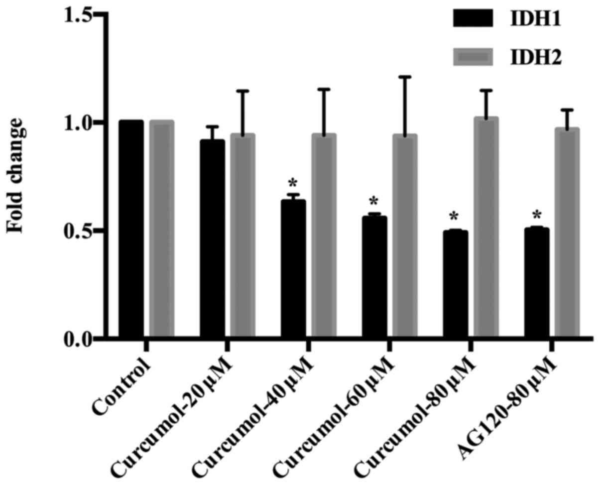 Our previous research revealed that curcumol increased the levels of ROS to promote cell death. However a study demonstrated that IDH1-dependent reductive carboxylation mitigated the intracellular ROS level and protected tumor cells from ROS damage. In order to explore the molecular mechanism through which curcumol inhibits cell proliferation, the expression levels of IDH1 and IDH2 were determined by western blotting. The expression levels of IDH1 were downregulated after cells were treated with 60 or 80 µM of curcumol, but the expression levels of IDH2 were not altered by curcumol. AG-120 (80 µM) treatment was used as a positive control (Fig. 7). The result of RT-qPCR confirmed the same tendency in the gene expression of IDH1 and IDH2. In contrast to the negative control group, the expression level of IDH1 was significantly decreased after 48 h of treatment with curcumol at 40, 60 and 80 µM (Fig. 8). The results may reveal a new molecular mechanism in gastric cell apoptosis induced by curcumol.