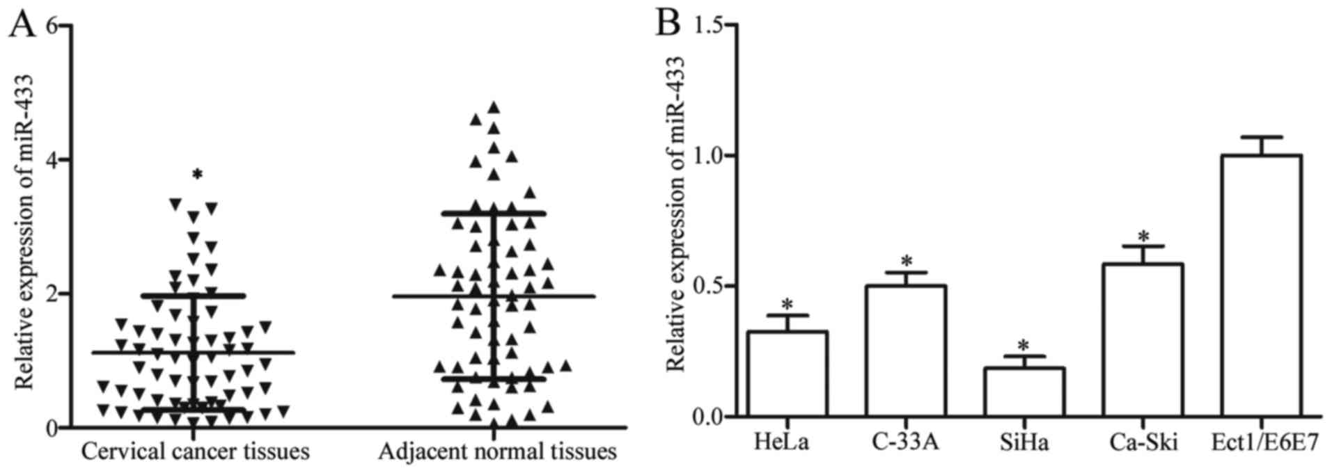 In the present study, we first examined miR-433 expression in cervical cancer and corresponding adjacent normal tissues by RT-qPCR. Our results showed much higher miR-433 expression in the adjacent normal tissues than that observed in the cervical cancer tissues (Fig. 1A; P<0.05). We then investigated the association between miR-433 and clinicopathological features in cervical cancer. The median miR-433 expression level (median=0.8902) was regarded as a cut-off to divide all cervical cancer patients into either the miR-433 low-expression group (n=33) or miR-433 high-expression group (n=32). As shown in Table II, low miR-433 expression level was significantly correlated with tumour size (P=0.018), FIGO stage (P=0.031), lymph node (P=0.001) and distant metastases (P=0.032). However, no significant correlations were noted between miR-433 expression and age (P=0.685), histology (P=0.526), HPV infection (P=0.247) and family history of cancer (P=0.163).