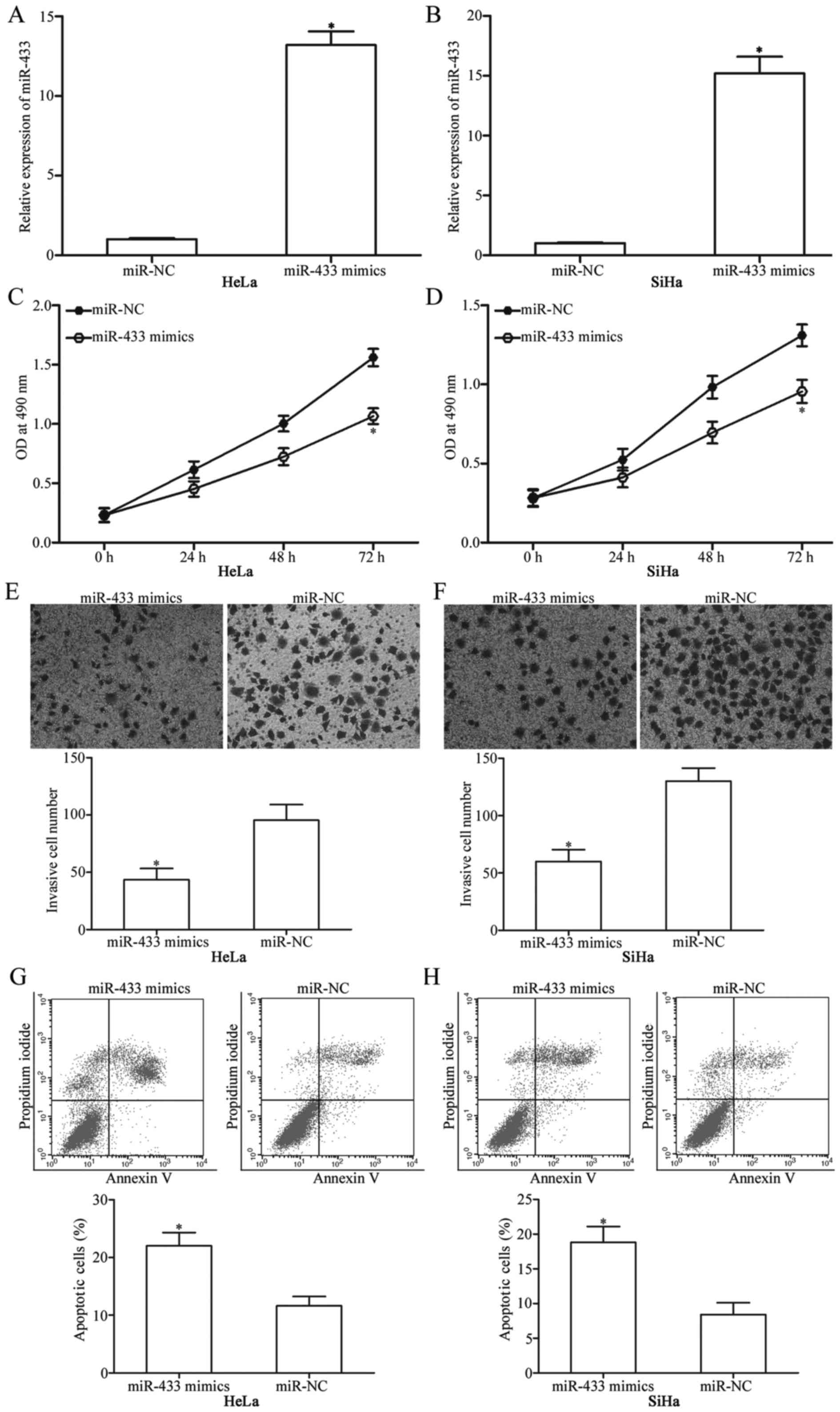 Downregulation of miR-433 in cervical cancer prompted us to explore whether miR-433 acts as a tumour suppressor in cervical cancer. Therefore, we examined the effects of miR-433 overexpression on cervical cancer cells. HeLa and SiHa cells, which expressed relatively low miR-433 expression among the 4 examined cervical cancer cell lines, were transfected with miR-433 mimics or miR-NC. Expression levels determined through RT-qPCR confirmed marked upregulation of miR-433 in the HeLa and SiHa cells transfected with miR-433 mimics (Fig. 2A and B; P<0.05). Firstly, we measured cellular proliferation using MTT assay after transfection of HeLa and SiHa cells with miR-433 mimics or miR-NC. The results showed that restoration of the expression of miR-433 significantly decreased proliferation of the HeLa and SiHa cells compared with that noted in the miR-NC group (Fig. 2C and D; P<0.05). HeLa and SiHa cells were transfected with miR-433 mimics or miR-NC; and cell invasion assay was performed to evaluate the effects of miR-433 restoration on the invasion of these cells. Invasion capabilities of HeLa and SiHa cells were significantly suppressed when cells were transfected with the miR-433 mimics (Fig. 2E and F; P<0.05). Flow cytometric analysis was used to determine the apoptosis rates of the HeLa and SiHa cells transfected with the miR-433 mimics or miR-NC. The results revealed that at 72 h after transfection, the apoptosis rate was significantly increased in the HeLa and SiHa cells transfected with miR-433 mimics compared with that noted in the miR-NC controls (Fig. 2G and H; P<0.05). These results indicate that miR-433 acts as a tumour suppressor in cervical cancer.