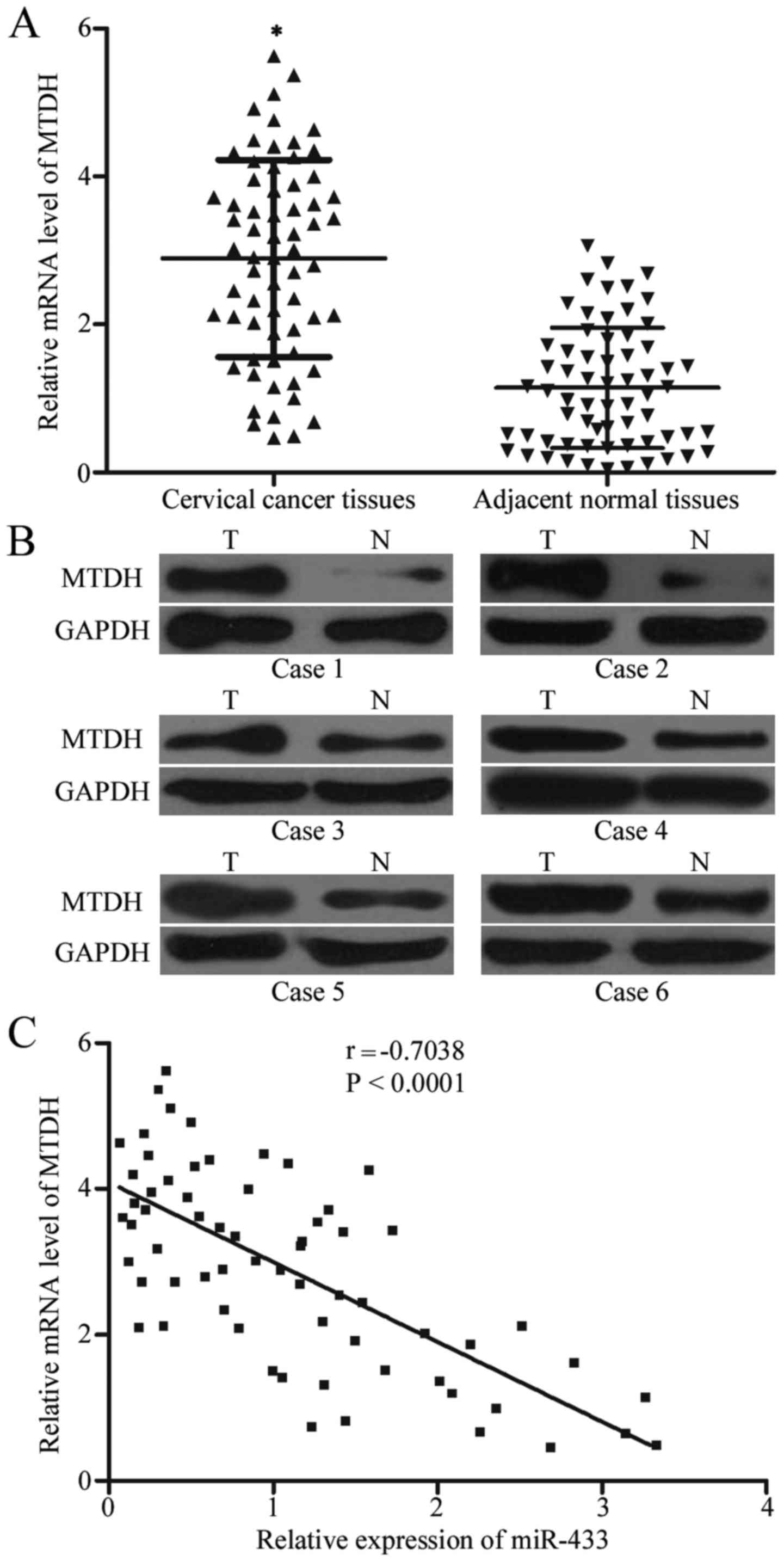 miRNA-433 (miR-433) has been studied in several types of human cancer (24–26). However, little information is available concerning the expression pattern and biological roles of miR-433 in cervical cancer. In the present study, we investigated the miR-433 expression pattern in cervical cancer, the effects of miR-433 on cervical cancer cells and the underlying molecular mechanisms. Metadherin (MTDH) (also known as AEG-1 or LYRIC) was predicted as a potential target of miR-433 and was selected for further target identification; this gene is upregulated in cervical cancer tissues and contributes to cervical cancer occurrence and progression (27,28). The present study may provide novel insights into cervical cancer initiation and progression and strategies for cervical cancer treatment.