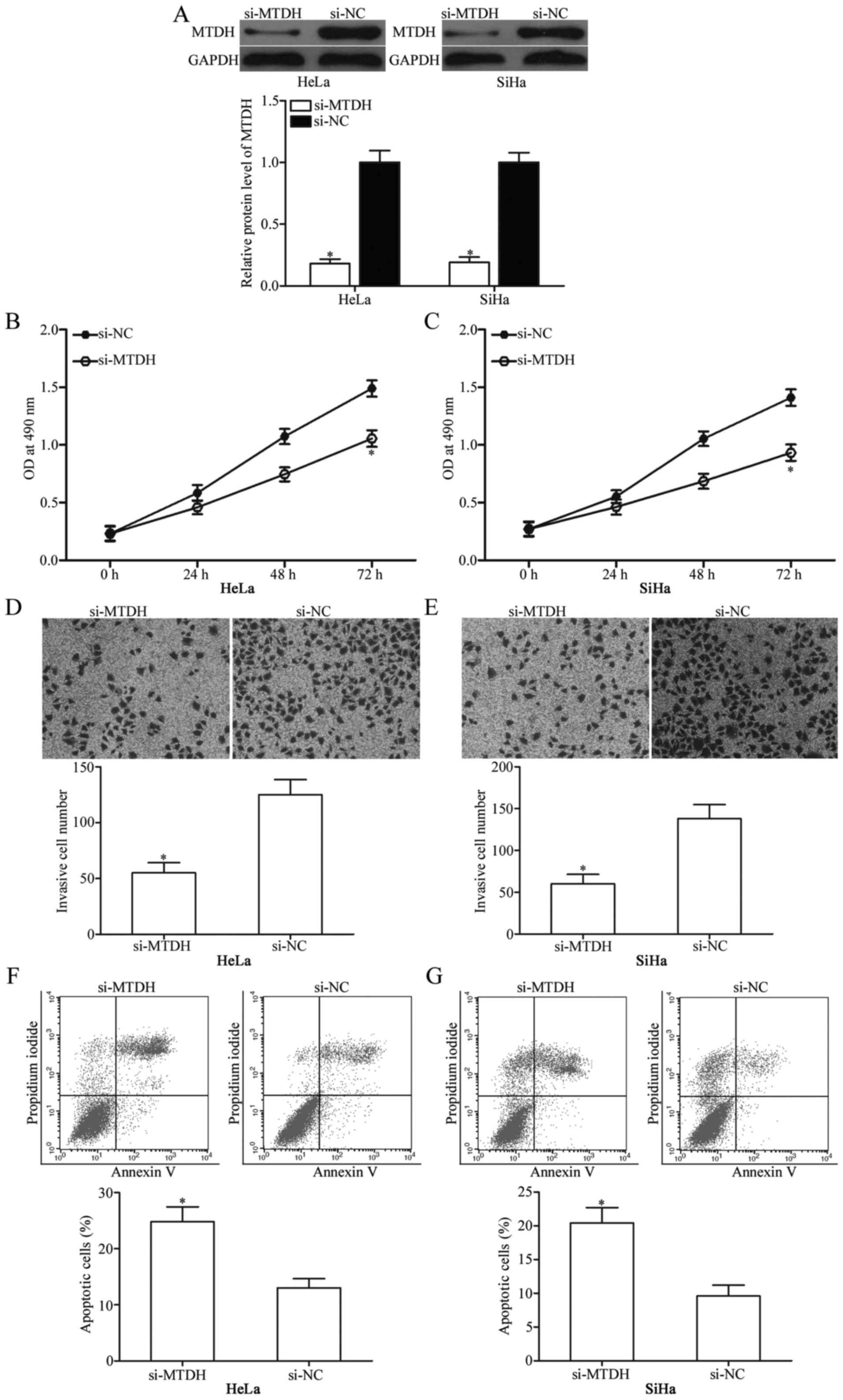 To investigate whether downregulation of MTDH expression exhibits tumour-suppressive functions similar to those of miR-433 overexpression in cervical cancer, HeLa and SiHa cells were transfected with si-MTDH to genetically knock down endogenous MTDH expression (Fig. 5A; P<0.05). Next, MTT assay, cell invasion assay and flow cytometric analysis were conducted in HeLa and SiHa cells transfected with si-MTDH or si-NC. The results showed that MTDH knockdown exhibited tumour-suppressive roles similar to those of miR-433 overexpression in cervical cancer cell proliferation (Fig. 5B and C; P<0,05), invasion (Fig. 5D and E; P<0,05) and apoptosis (Fig. 5F and G; P<0,05) and further suggest that MTDH is a functional downstream target of miR-433 in cervical cancer.