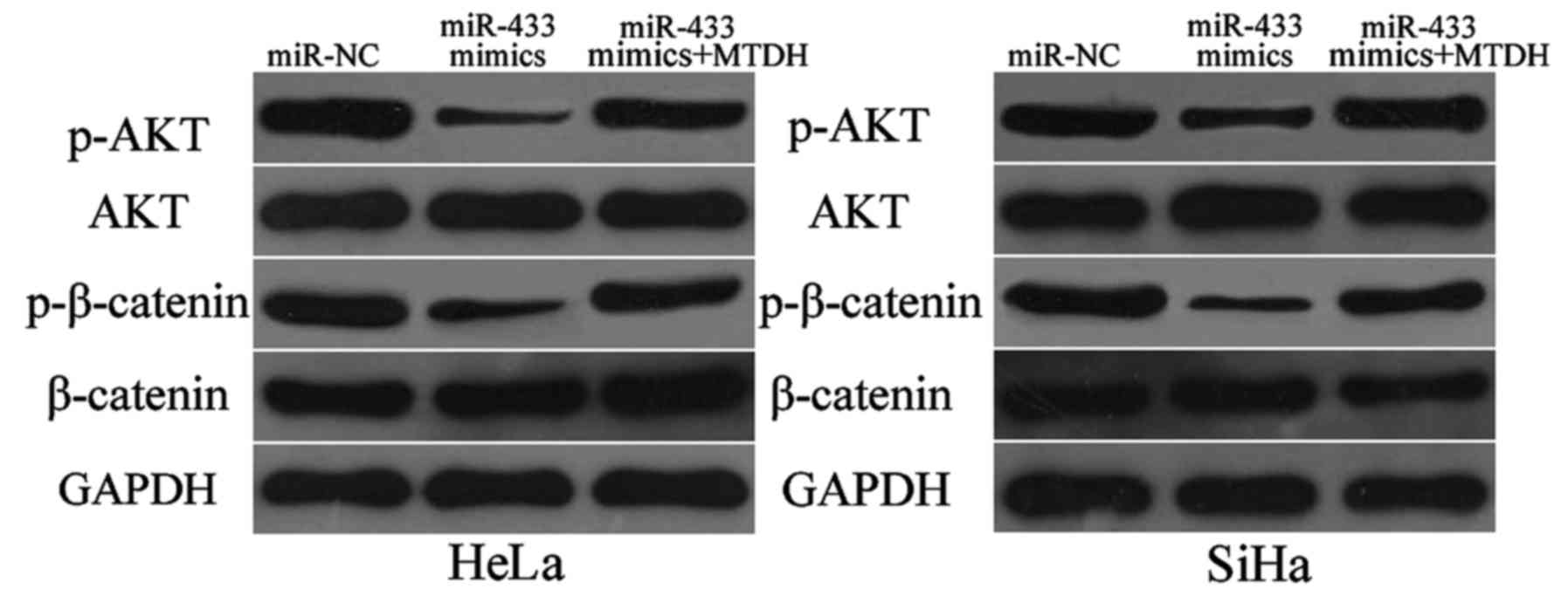 MTDH was previously reported to play essential roles inthe regulation of the AKT and β-catenin pathways (31,32). Thus, we detected expression levels of p-AKT, AKT, p-β-catenin and β-catenin in HeLa and SiHa cells after transfection with miR-433 mimics or miR-NC. As shown in Fig. 7, restoration of expression of miR-433 decreased p-AKT and p-β-catenin expressions in the HeLa and SiHa cells. However, this restored expression did not affect total AKT and β-catenin expression. We also noted recovered expression levels of p-AKT and p-β-catenin in the miR-433 mimic-transfected HeLa and SiHa cells cotransfected with pcDNA3.1-MTDH. These results indicate that miR-433 exerts tumour-suppressing roles in cervical cancer cells by directly targeting MTDH and affecting downstream AKT and β-catenin pathways.