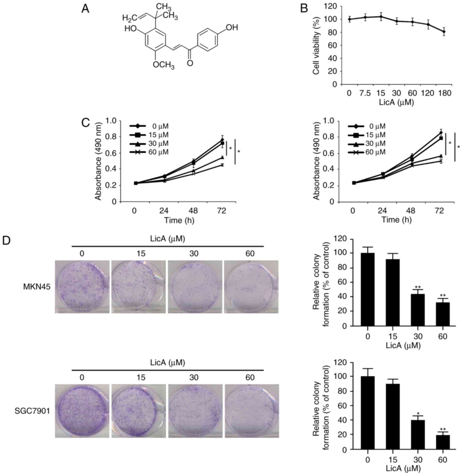 Hao W, Yuan X, Yu L, Gao C, Sun X, Wang D and Zheng Q: Licochalcone A-induced human gastric cancer BGC-823 cells apoptosis by regulating ROS-mediated MAPKs and PI3K/AKT signaling pathways. Sci Rep. 5:103362015. View Article : Google Scholar : PubMed/NCBI | |