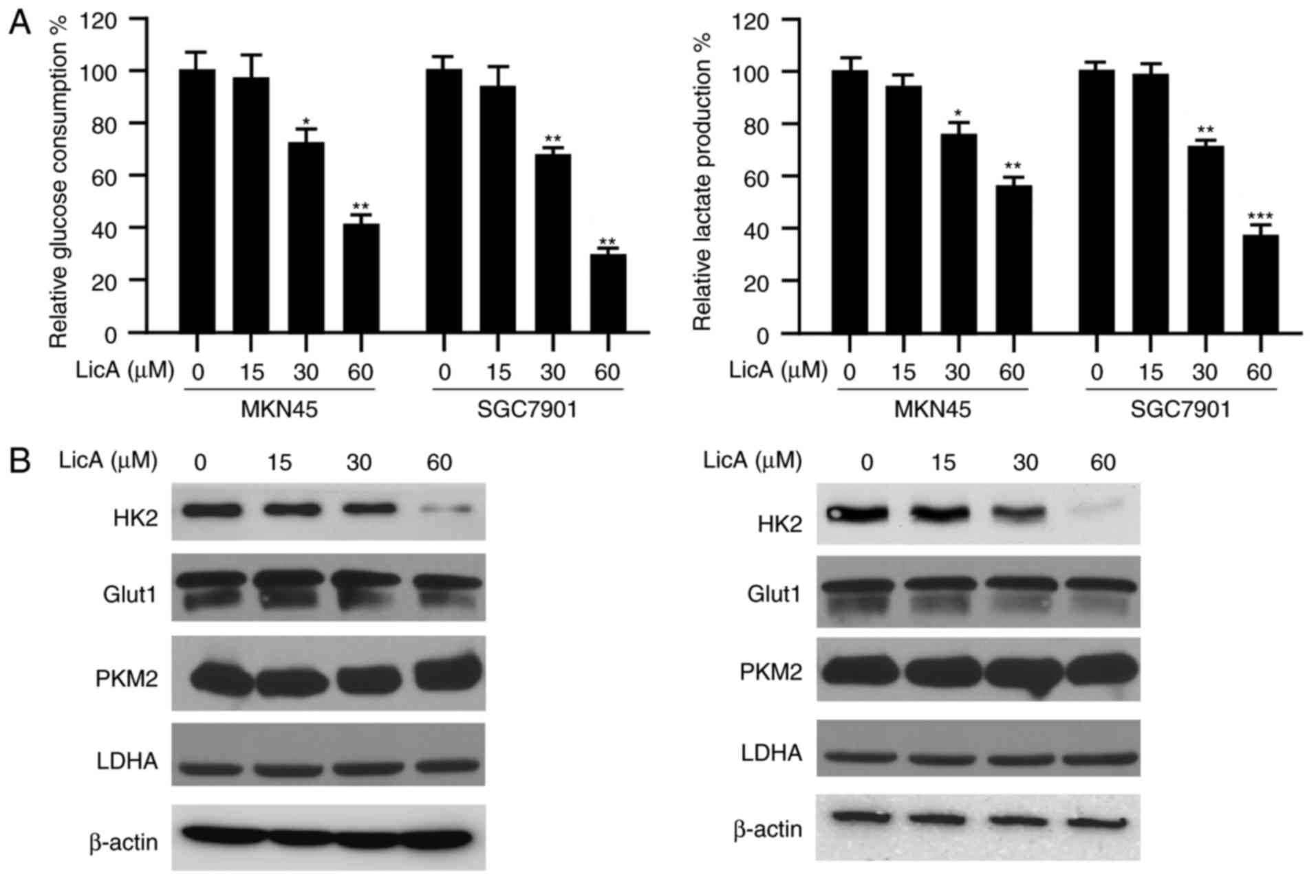 In order to study the effect of LicA on tumor glycolysis, the amount of glucose consumption in gastric cancer cells was determined. As shown in Fig. 2A, after LicA treatment, the glucose consumed by MKN45 and SGC7901 cells was significantly decreased dose-dependently. At the high concentration of 60 µM, ~50% inhibition was observed. Accompanied by the reduction of glucose absorption, the amount of lactate secreted by gastric cancer cells was also decreased significantly. Furthermore, we tested the effect of LicA on key glycolytic enzymes and the results demonstrated that the expression of HK2 was decreased by LicA. The expression of other glycolytic enzymes, such as GLUT1, PKM2 and LDHA, had no obvious change (Fig. 2B). All these data imply that HK2 is involved in the suppression of glycolysis mediated by LicA.