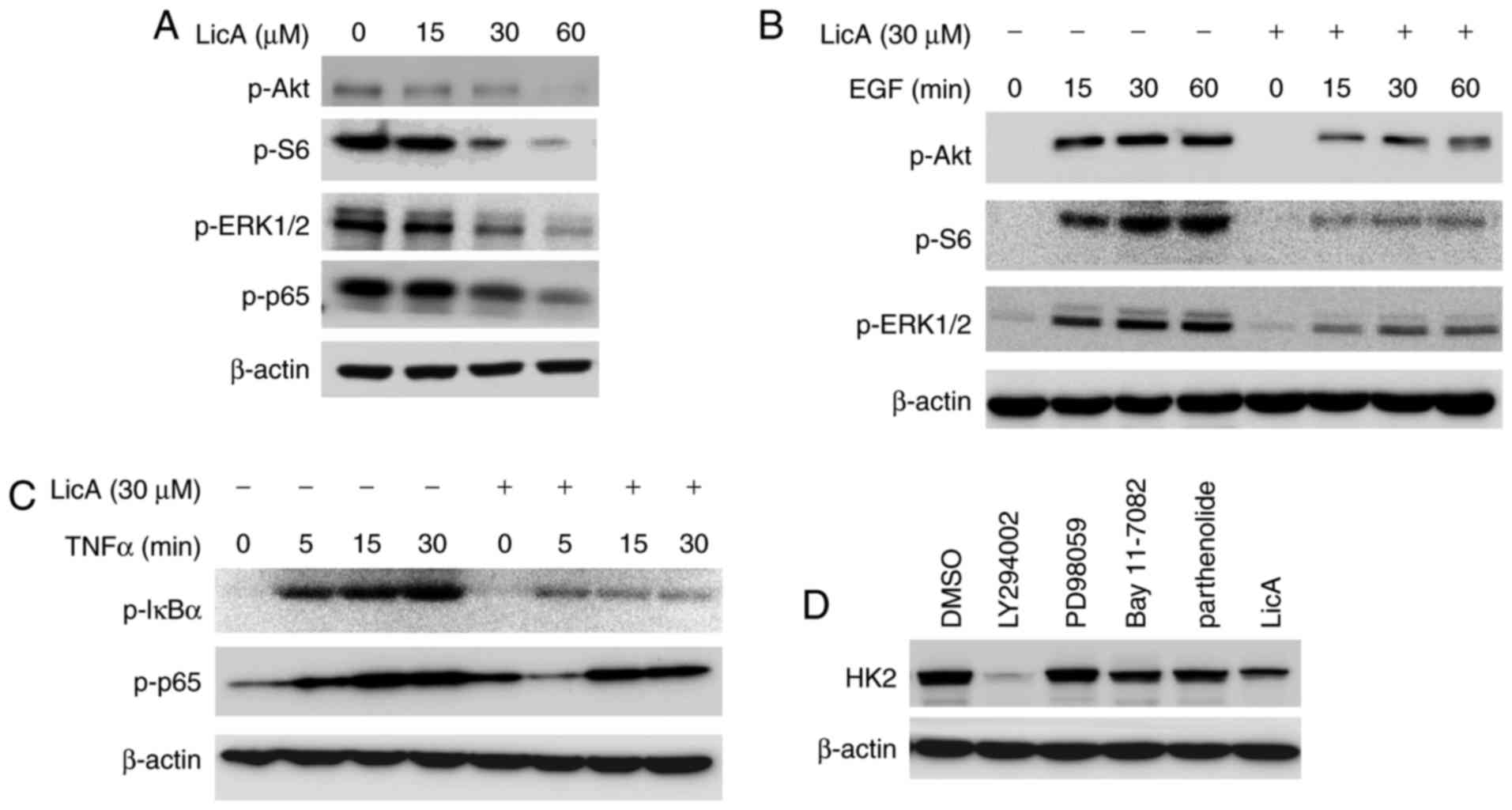 To confirm which signaling pathway is engaged in the regulation of HK2 expression, the effect of LicA on the main signaling pathways in gastric cancer cells was investigated. As demonstrated, several signaling pathways in gastric cancer, such as ERK, Akt and NF-κB were blocked by LicA dose-dependently (Fig. 3A). To further validate the inhibition of these pathways, we examined the effect of LicA on EGF-induced activation of ERK and Akt, as well as TNF-α-induced NF-κB activation. As shown in Fig. 3B and C, the activation of ERK, Akt and NF-κB signaling was suppressed by LicA dose and time-dependently. By using different specific signaling pathway inhibitors to treat gastric cancer cells and observe the change in HK2 expression, we identified that LY294002, a specific PI3-K inhibitor, demonstrated a similar effect on HK2 as LicA, implying that the Akt signaling pathway may be involved in the mediation of HK2 expression (Fig. 3D).