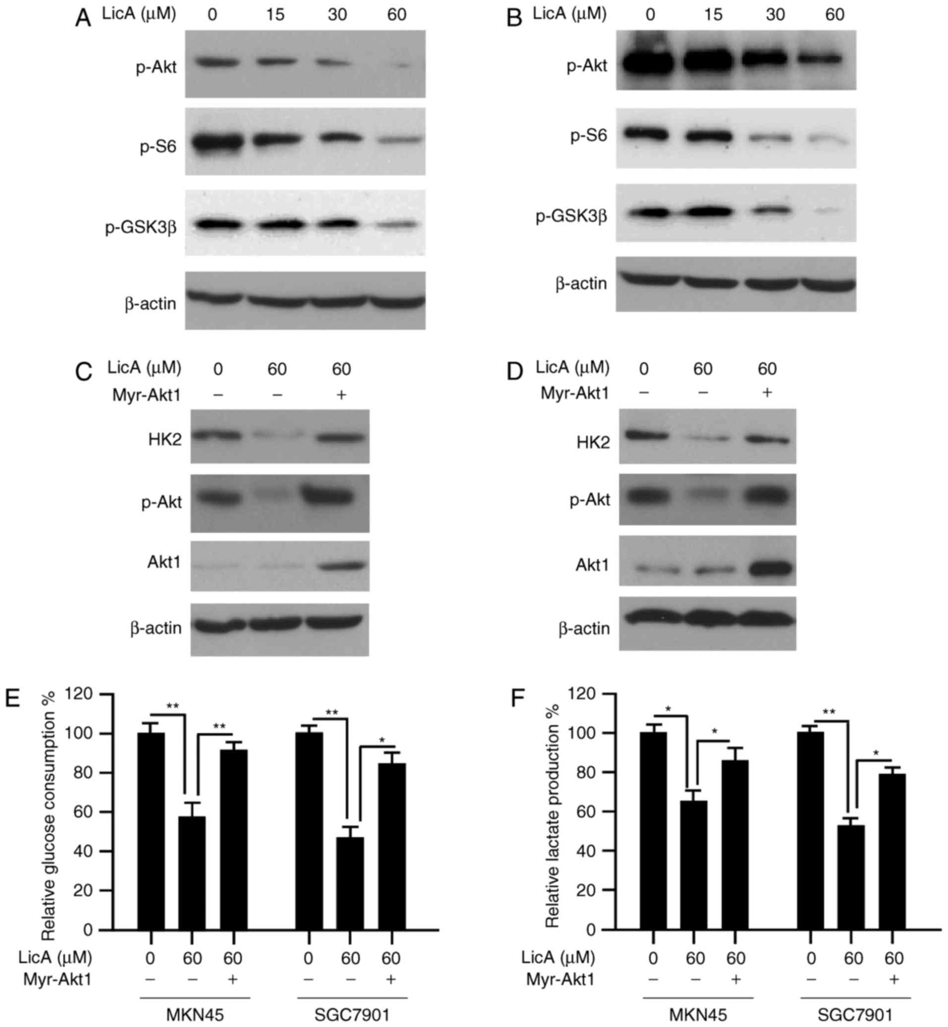 Based on the results shown above, the HK2 decrease caused by LicA may be attributed to the blockade of Akt activation, thus, we tested the effect of LicA on the Akt signaling pathway. After LicA treatment, along with the inactivation of Akt, the phosphorylation of S6 and GSK3β, which are the main downstream signaling of Akt, were inhibited dose-dependently (Fig. 4A and B). To illustrate the importance of Akt in the regulation of HK2 expression, constitutively activated Akt1 (myr-Akt1) was transfected into MKN45 and SGC7901 cells. As expected, with the recovery of Akt activity in gastric cancer cells, HK2 reduction caused by LicA was notably reversed (Fig. 4C and D). Moreover, glucose consumption and lactate production in myr-Akt1 transfected cells were also significantly increased (Fig. 4E and F). These results demonstrated that Akt-mediated HK2 expression plays a pivotal role in the effectd of LicA on tumor glycolysis.
