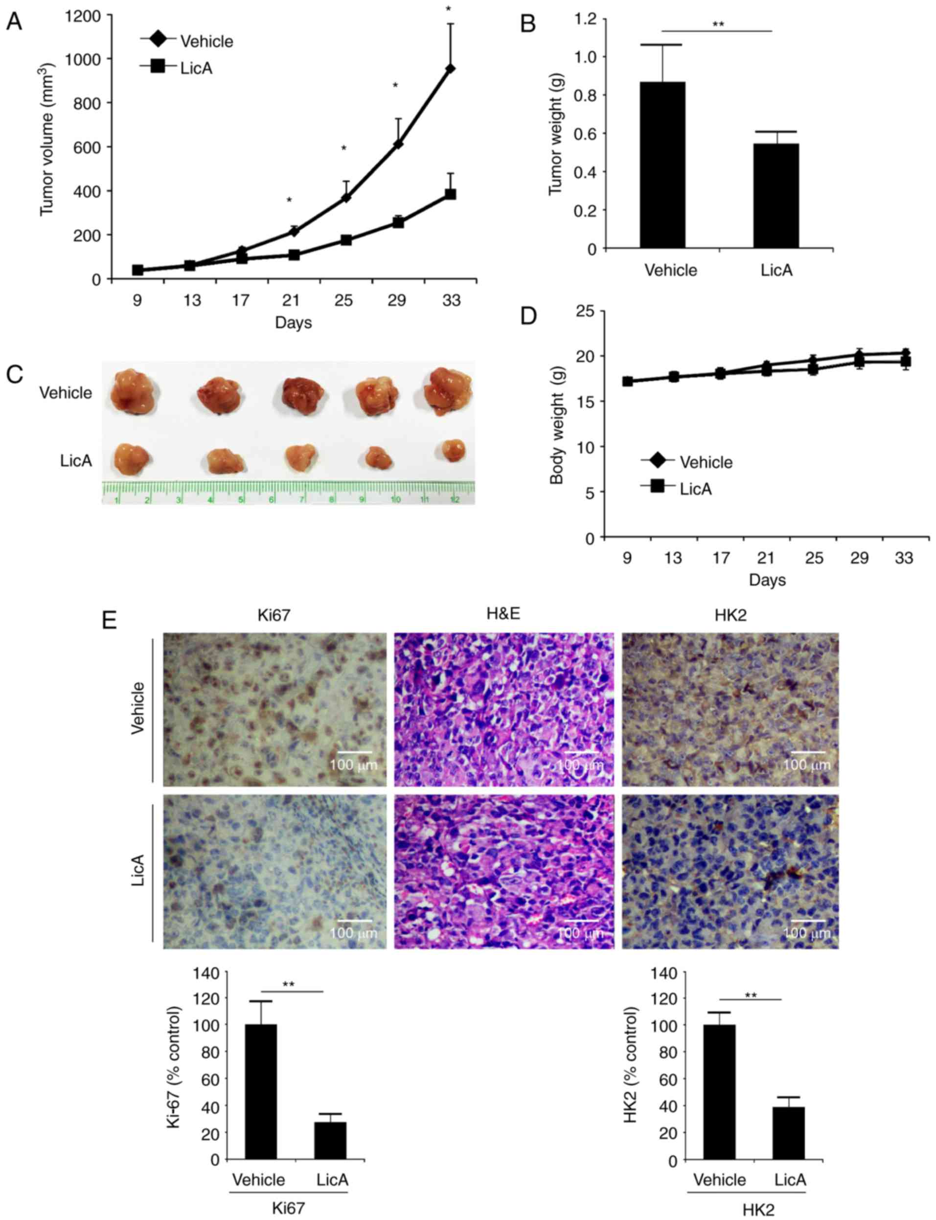 The in vivo antitumor activity of LicA was investigated in an MKN45 xenograft model. In contrast with the vehicle group, tumor growth in the LicA-treated group was significantly inhibited (Fig. 6A-C). The tumor volume of the vehicle group had reached about 900 mm3, whereas the average volume of the LicA-treated group was ~400 mm3. The tumor weight of the LicA-treated group was also significantly smaller than the vehicle group (0.52 vs. 0.85 g). Based on the change in body weight, no obvious toxicity was observed (Fig. 6D). As shown in Fig. 6E, immunohistochemistry staining of LicA-treated tumor tissues demonstrated that the expression of HK2 was substantially decreased. Meanwhile, the expression of Ki-67, a marker of cell proliferative potential, was also decreased, indicating that LicA inhibited tumor growth in vivo by suppressing tumor glycolysis.