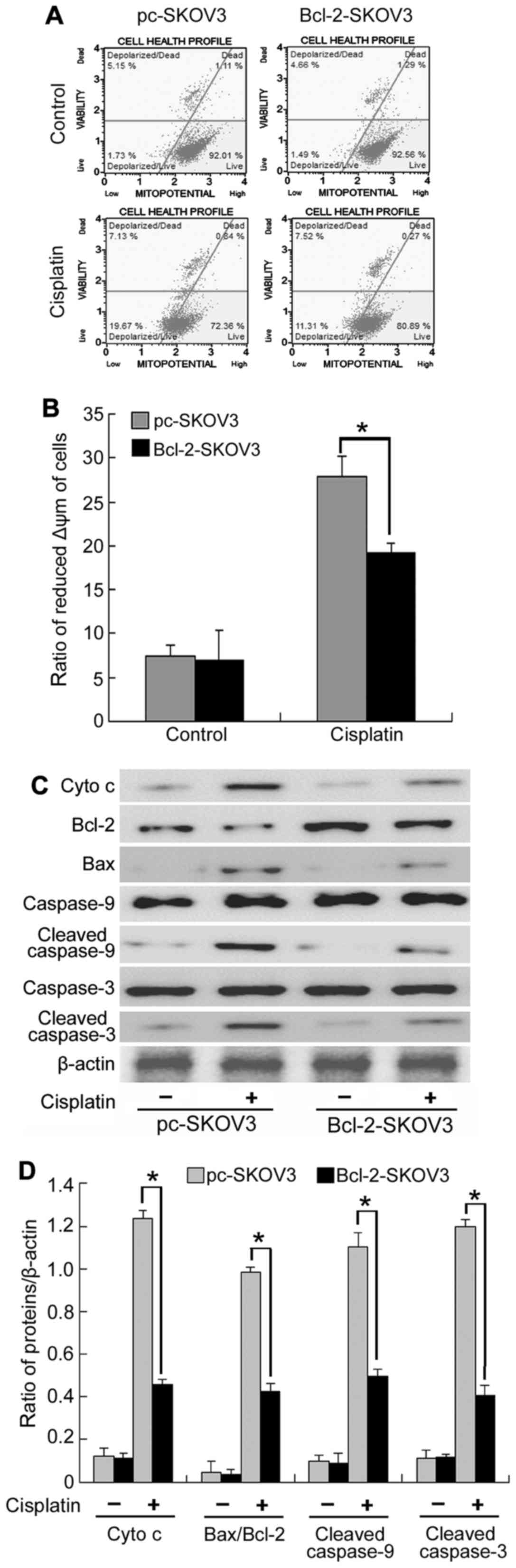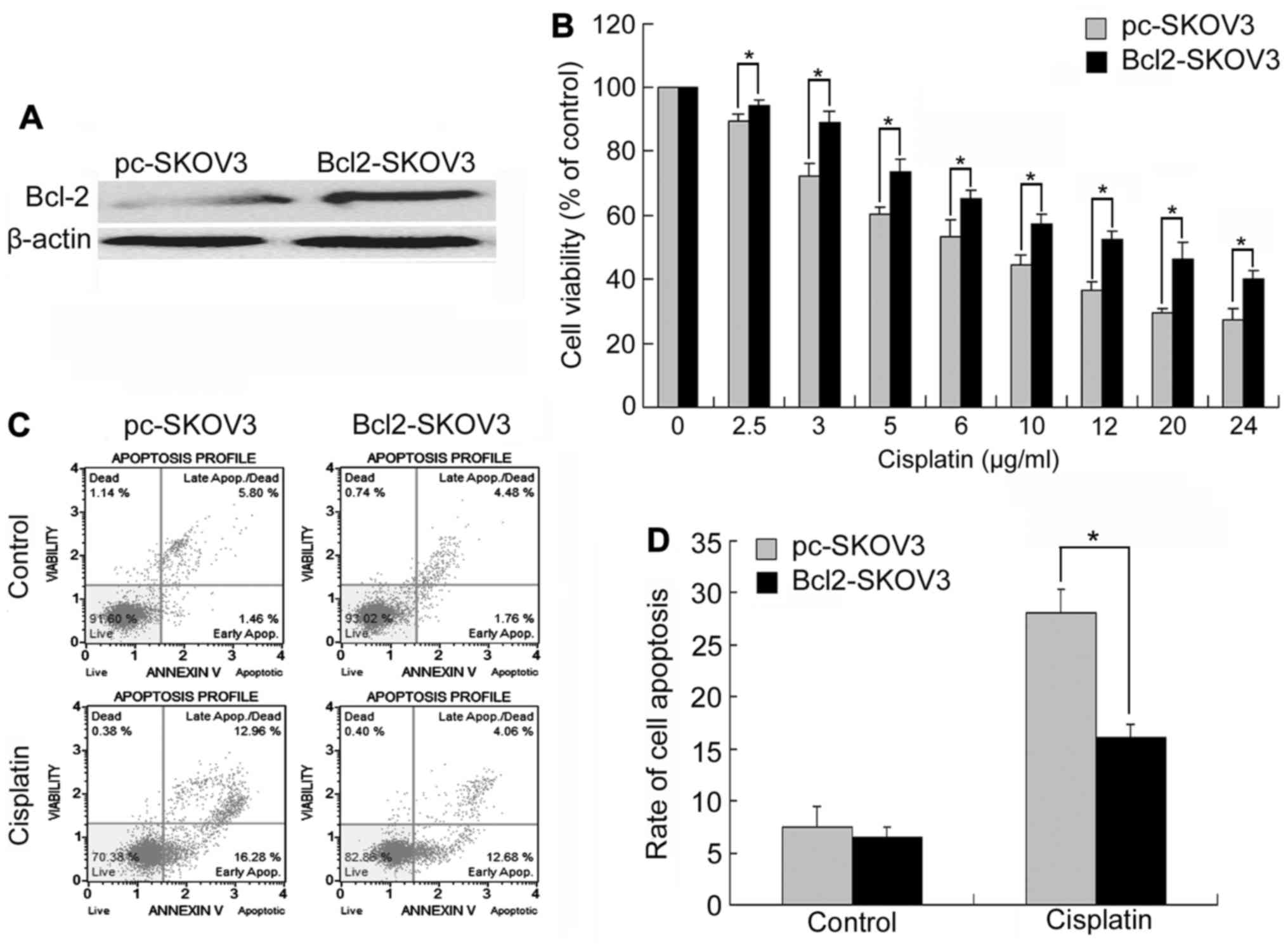 Subsequently, we treated both cell lines with 6 µg/ml cisplatin for 24 h, and then assessed the levels of apoptosis by flow cytometry. Cisplatin induced a higher apoptosis rate in the pc-SKOV3 cells than in the Bcl2-SKOV3 cells (Fig. 1C and D). In conclusion, Bcl-2 inhibited cisplatin-induced apoptosis in SKOV3 cells.