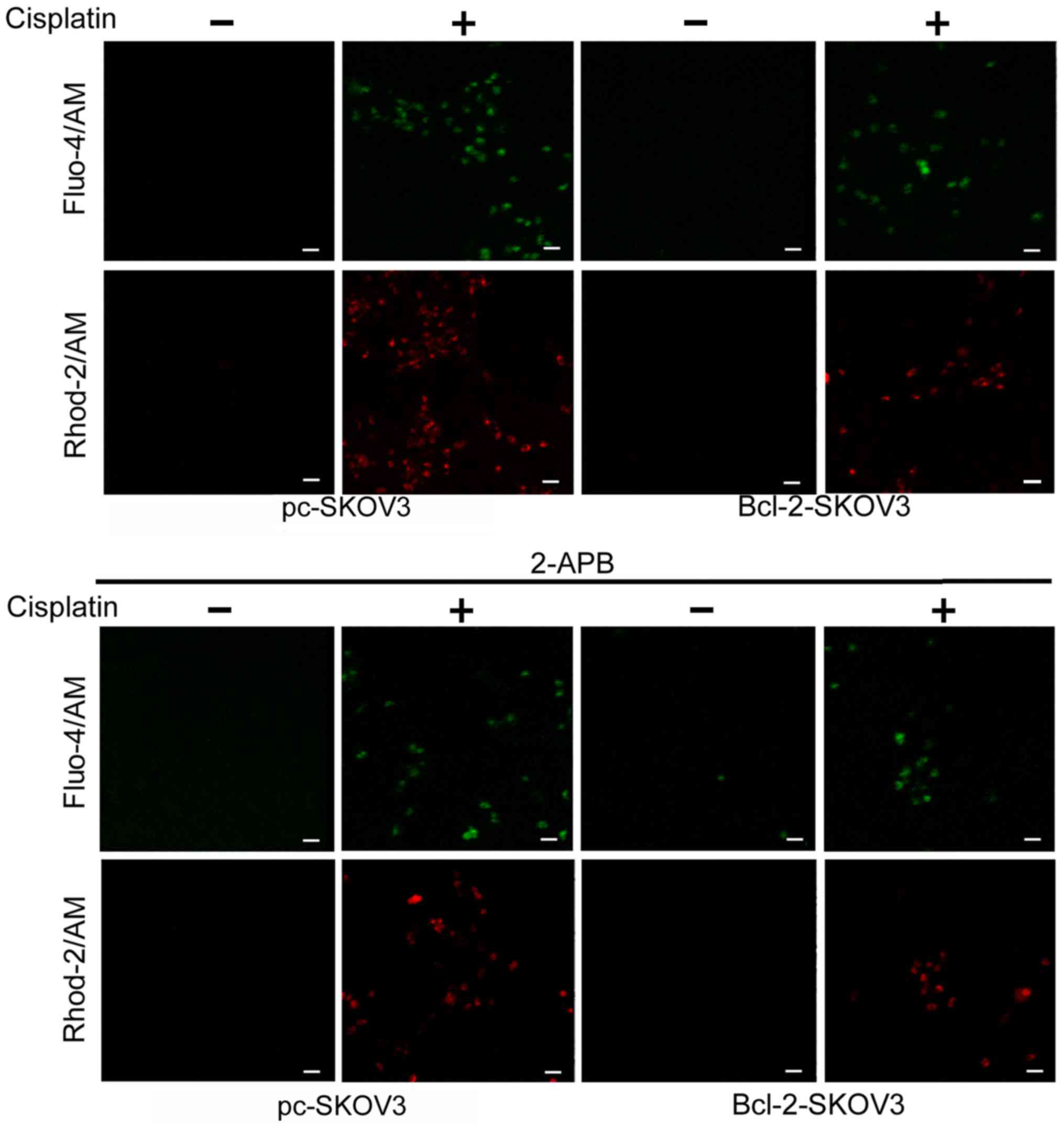 Previous studies indicate that Bcl-2 modulates cytosolic and mitochondrial Ca2+ levels in cancer cells (17). We assessed the relative cytosolic and mitochondrial Ca2+ levels in Bcl-2-SKOV3 and pc-SKOV3 cells treated with 6 µg/ml cisplatin for 24 h using the Fluo-4/AM and Rhod-2/AM indicators, respectively. Cisplatin treatment induced higher cytosolic and mitochondrial Ca2+ levels in pc-SKOV3 cells than in Bcl-2-SKOV3 cells (Fig. 2, upper panel). In order to demonstrate that cisplatin-induced cytosolic and mitochondrial Ca2+ accumulation derives from the ER, the IP3R chelator 2-APB was administered to both cell types in the presence and absence of cisplatin. Confocal microscopy revealed that 2-APB inhibited cisplatin-induced cytosolic and mitochondrial Ca2+ accumulation in both cell types (Fig. 2, lower panel). These findings demonstrated that Bcl-2 overexpression reduced cisplatin-induced Ca2+ release from the ER to the cytoplasm and mitochondria.