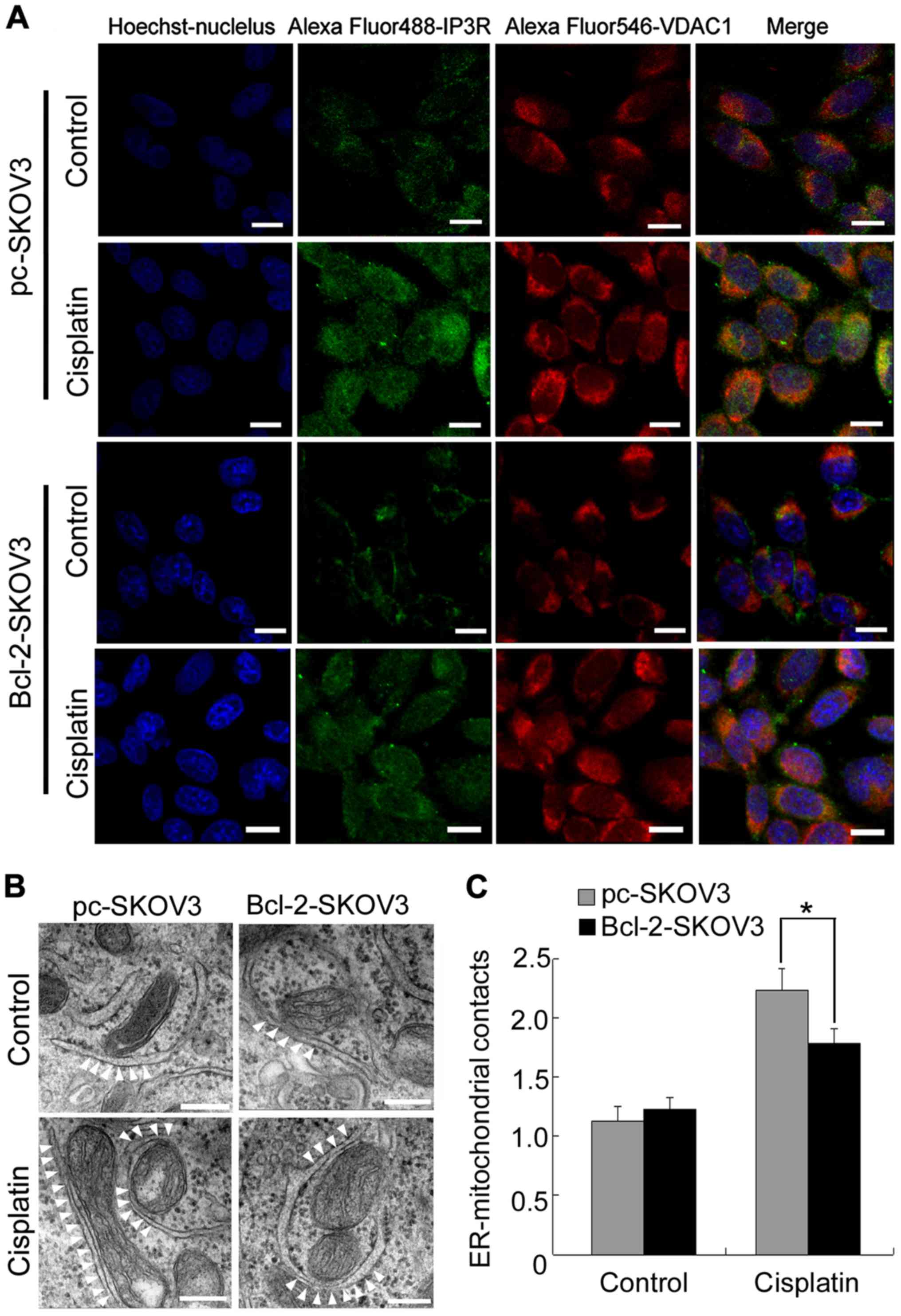 In conclusion, we demonstrated that Bcl-2 attenuated cisplatin-induced Ca2+ release from the ER into the cytosol and mitochondria, thus inhibiting cisplatin-induced ER stress-mediated apoptosis and activation of the mitochondrial apoptosis pathway. Furthermore, we revealed that decreased ER-mitochondrial crosstalk is responsible for Bcl-2 attenuation of cisplatin-induced mitochondrial Ca2+ accumulation in SKOV3 cells. Thus, Bcl-2 may be a novel marker of cisplatin resistance and thus, a potential therapeutic target for ovarian cancer chemotherapy.