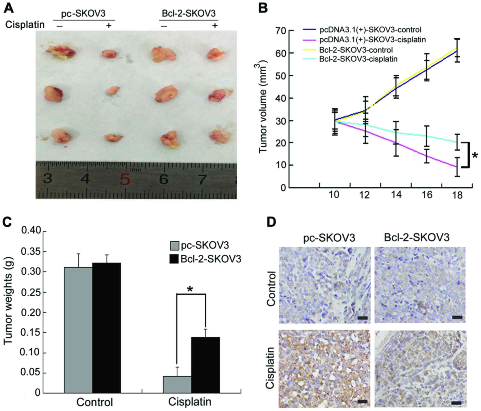 To further validate the effect of Bcl-2 overexpression on cisplatin-induced SKOV3 cell apoptosis in vivo, we established pc-SKOV3 and Bcl-2-SKOV3 xenograft models. Mice bearing xenograft tumors were treated with NS or cisplatin for 8 days, as described in the Materials and Methods section. Cisplatin inhibited the in vivo growth of pc-SKOV3 xenograft tumors more efficiently than that of Bcl-2-SKOV3 cells (Fig. 6A and B). In addition, cisplatin treatment led to a greater reduction in the weight of pc-SKOV3 xenograft tumors compared with Bcl-2-SKOV3 xenograft tumors (Fig. 6C). Regarding the effects of BCL-2 overexpression on cisplatin-induced apoptosis, a greater number of cleaved caspase-3-positive cells was observed in pc-SKOV3 than in Bcl-2-SKOV3 xenograft tumors after cisplatin treatment (Fig. 6D). These data indicated that Bcl-2 attenuated the in vivo antitumor activity of cisplatin in ovarian xenograft tumors.